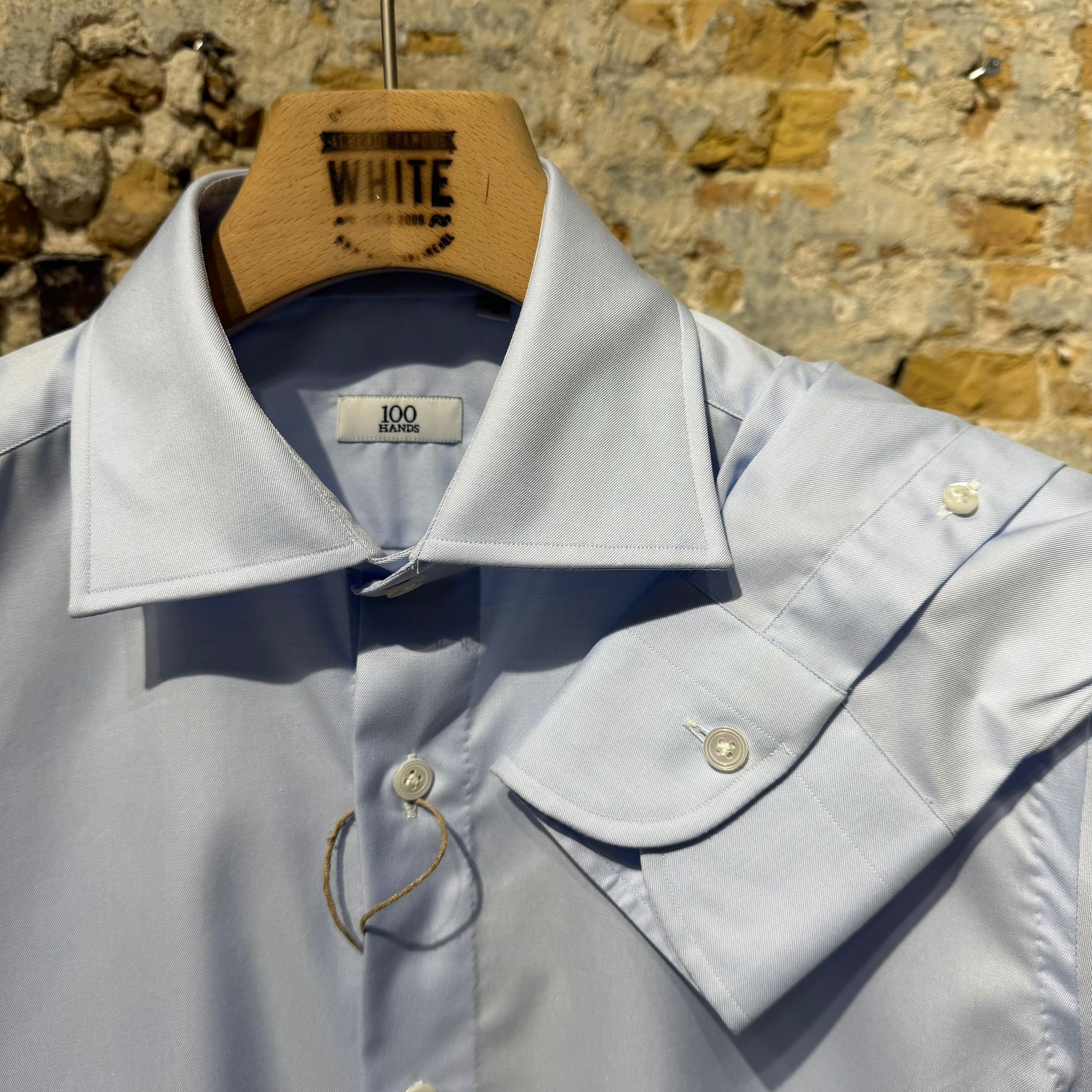 A refined light blue dress shirt from 100 Hands, crafted with the meticulous hand-finished construction the brand is known for. Made from fine cotton with a smooth, slightly structured weave, the fabric has a subtle sheen and elegant drape that elevates the classic shirt.