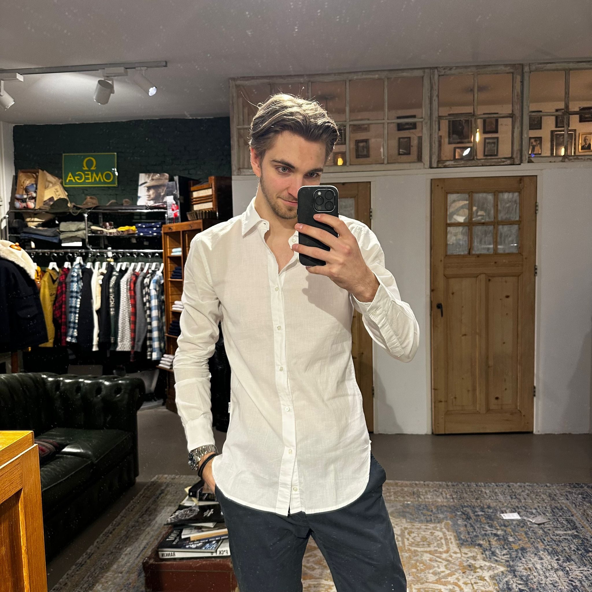 A crisp white shirt designed with a sharp collar and a clean, tailored silhouette that enhances a polished look. The minimalist design keeps it versatile and effortlessly elegant.