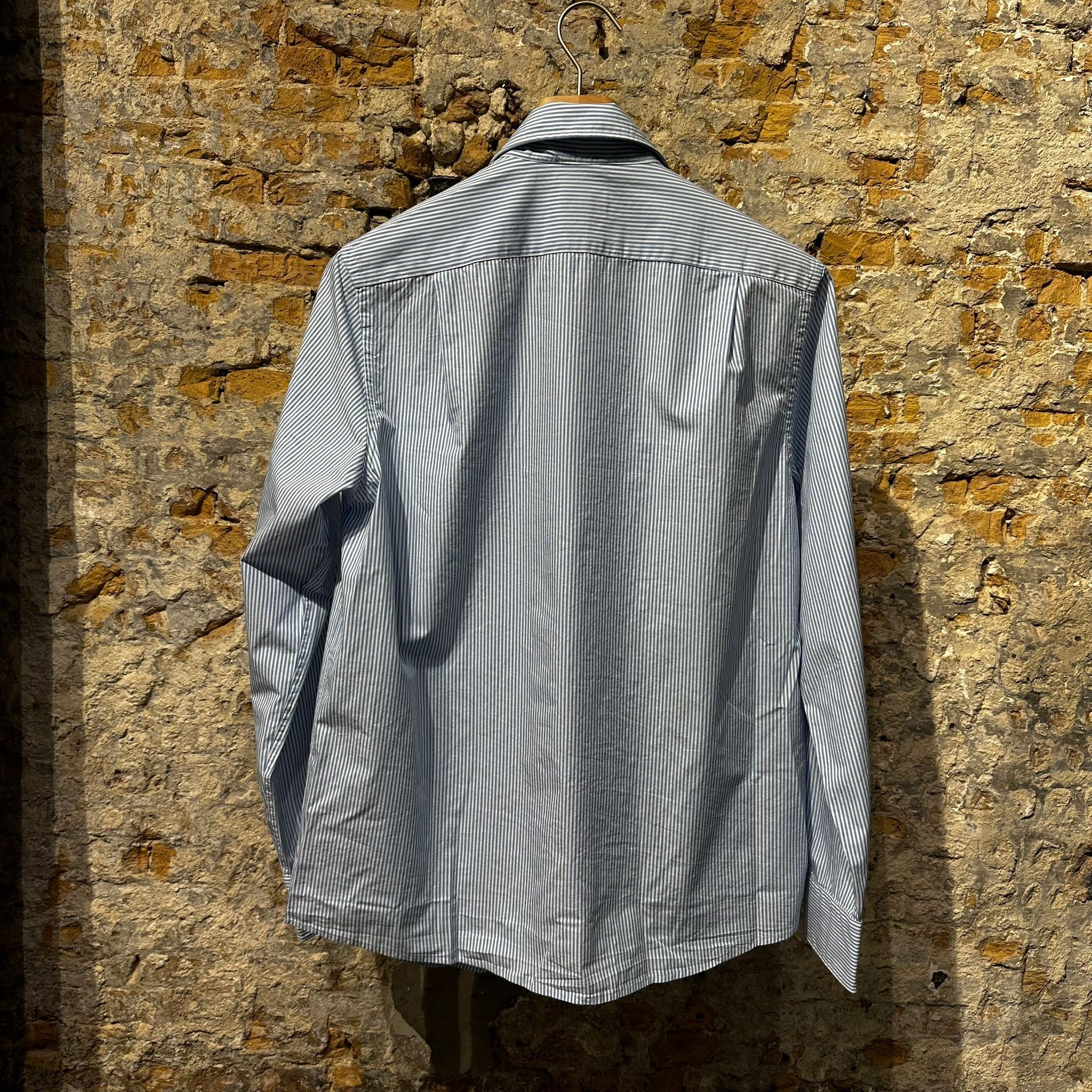 A refined long-sleeve shirt featuring fine blue and white vertical stripes for a timeless yet modern look. Designed with a sharp collar and a clean, tailored silhouette that enhances a sleek profile.