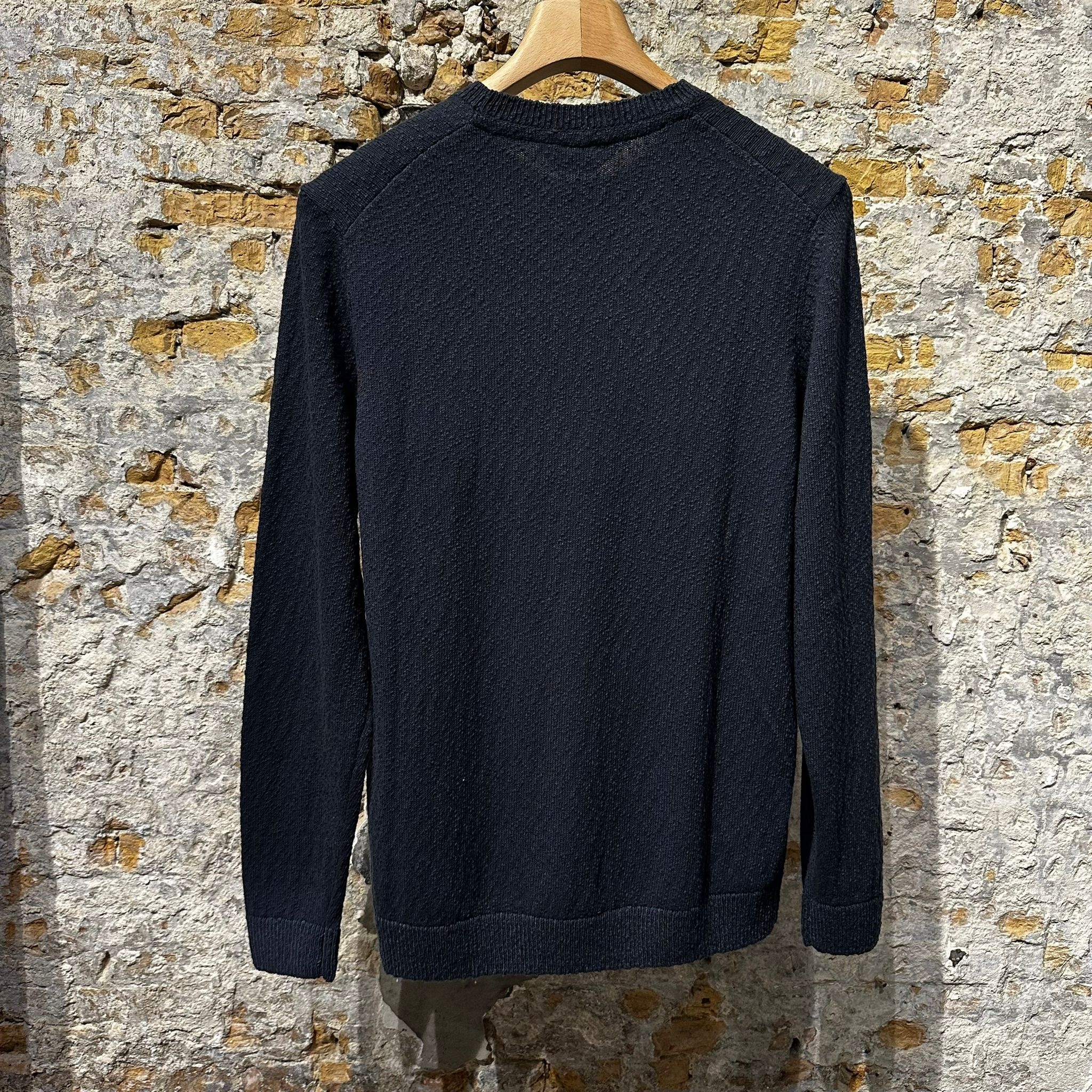 A clean, dark navy crew-neck sweater with a refined, textured knit that gives it subtle depth without feeling heavy. It has a classic, close-to-body fit with ribbed detailing at the collar, cuffs, and hem, making it easy to layer while still looking sharp on its own. The fabric appears soft and lightweight, ideal for transitional weather or indoor wear. Understated and versatile, it pairs effortlessly with tailored trousers or denim for a polished, everyday look.