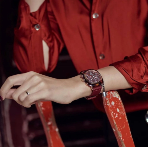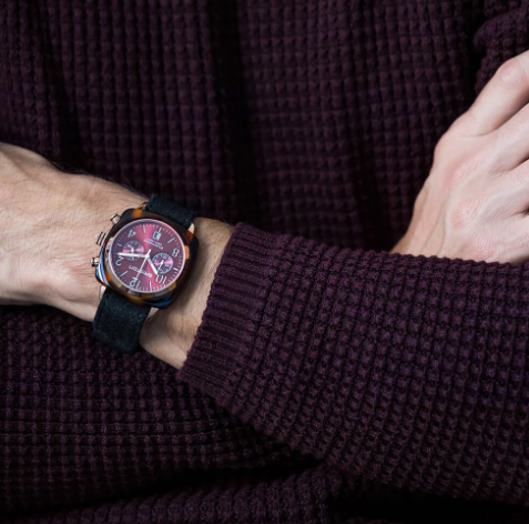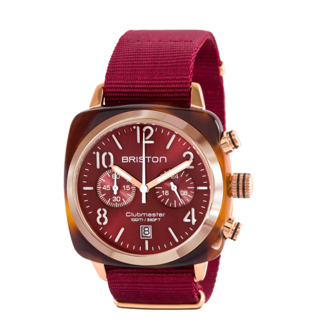 Clubmaster Classic chronograph watch, 40 mm. Stainless steel case with rose gold finish and tortoiseshell acetate. Red sunray dial. Chronograph, date, 2 counters. 60-minute counter at 9 o'clock, 24-hour counter at 3 o'clock. Hands with white Superluminova® luminescent inserts. Cambered mineral glass. Exclusive Briston interchangeable NATO strap (20 mm): red with rose gold steel buckles. Miyota OS21 quartz calibre.