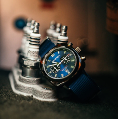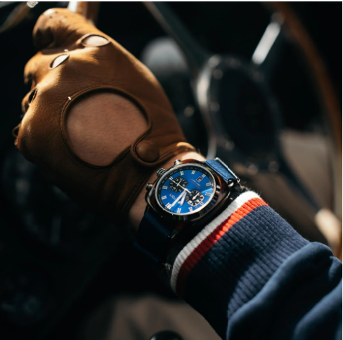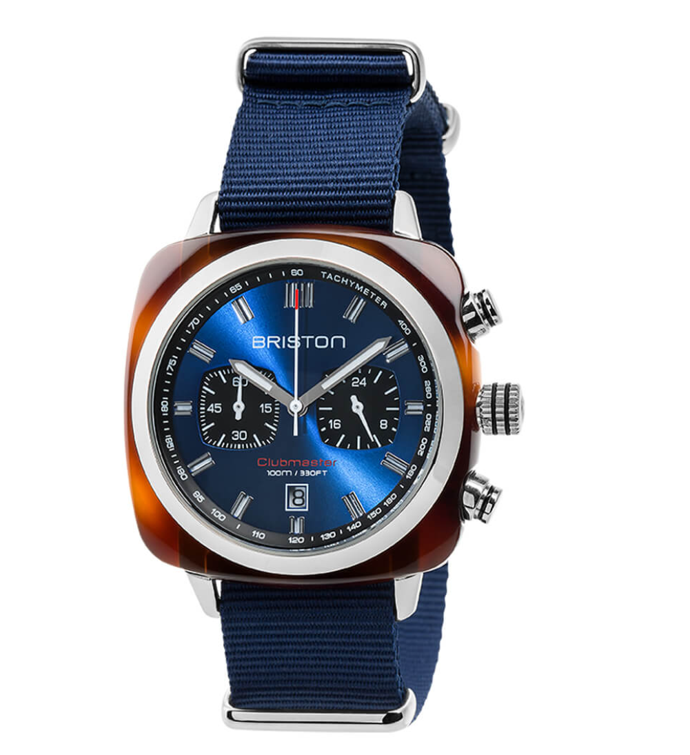 Clubmaster Sport chronograph watch, 42 mm. Steel and tortoiseshell acetate case. Navy blue sunray dial. Chronograph, date, 2 counters. 60-minute counter at 9 o'clock, 24-hour counter at 3 o'clock. Hands with white Superluminova® luminescent inserts. Domed mineral crystal. Exclusive Briston interchangeable strap: navy blue with polished steel buckles. Miyota OS21 quartz calibre.