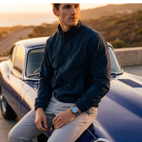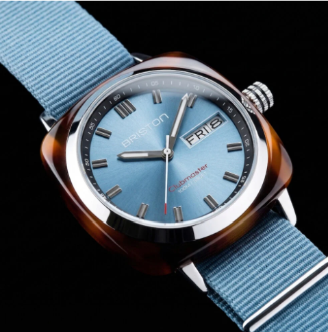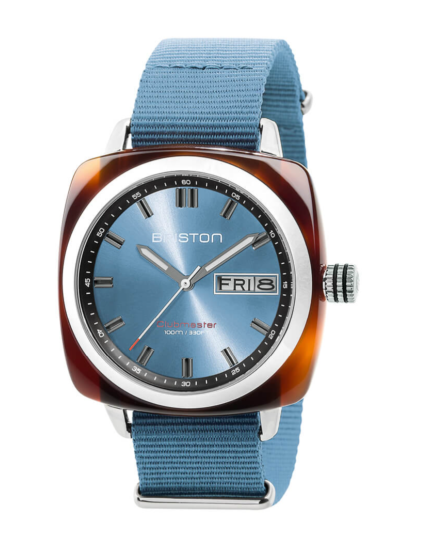 HMS Clubmaster Sport watch, 42 mm. Steel and tortoiseshell acetate case. Ice blue sunray dial. Hours, minutes, seconds and date with day of the week indication. Hands with white Superluminova® luminescent inserts. Domed mineral crystal. Exclusive Briston interchangeable NATO strap: ice blue with polished steel buckles. Miyota 2405 Japanese quartz calibre.