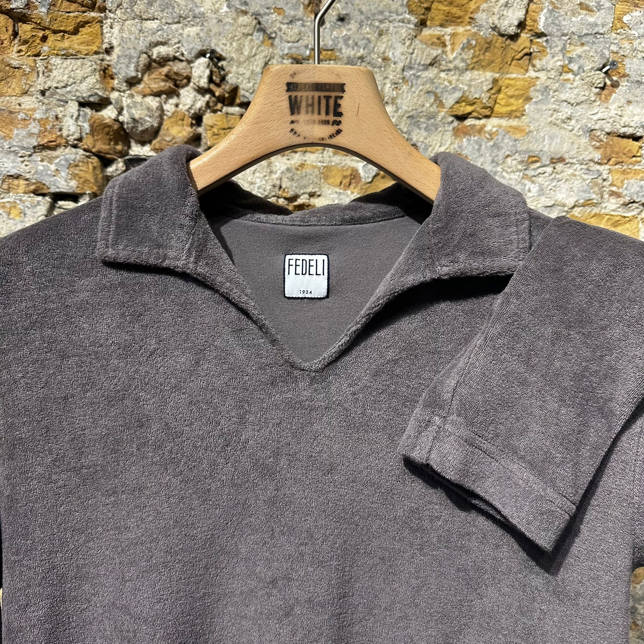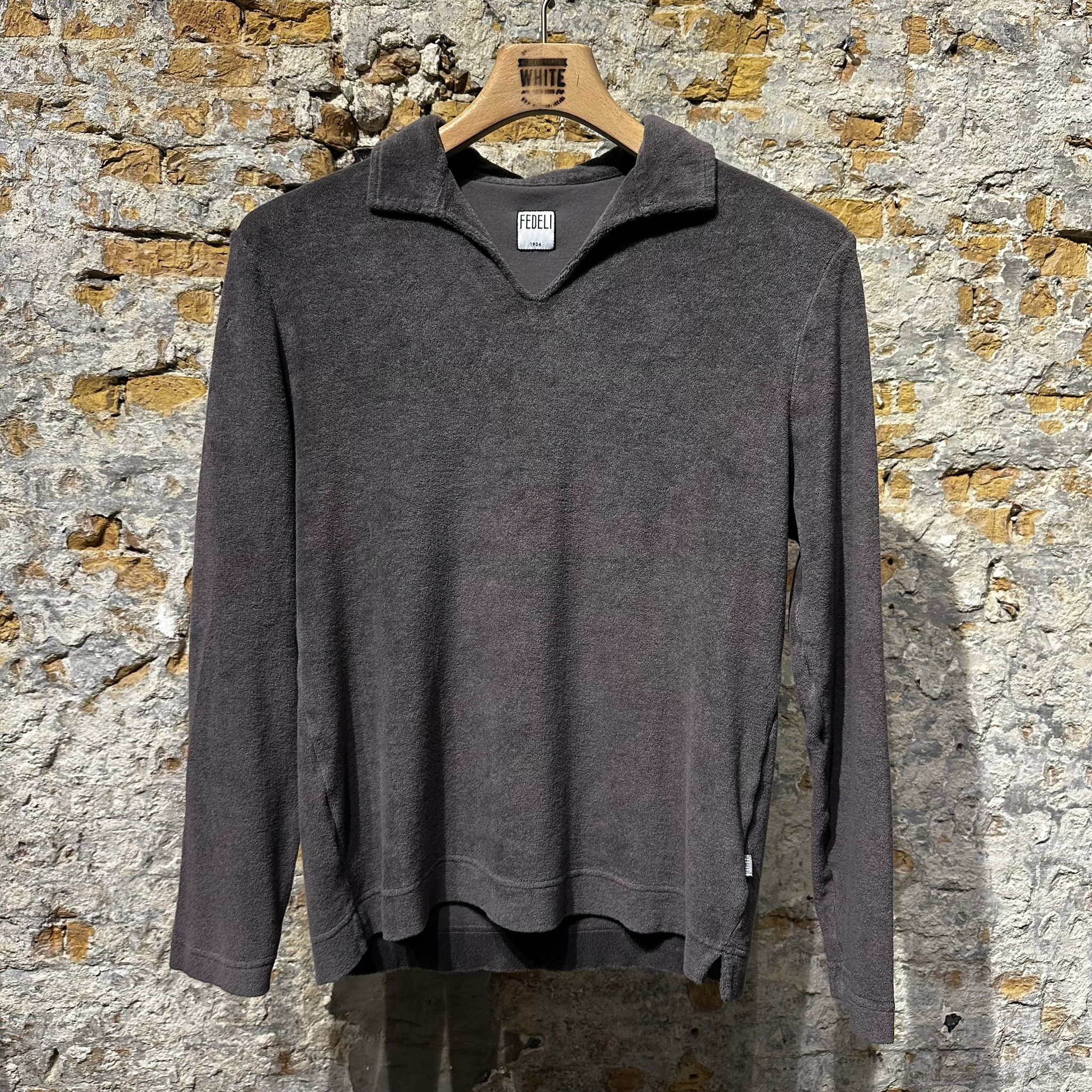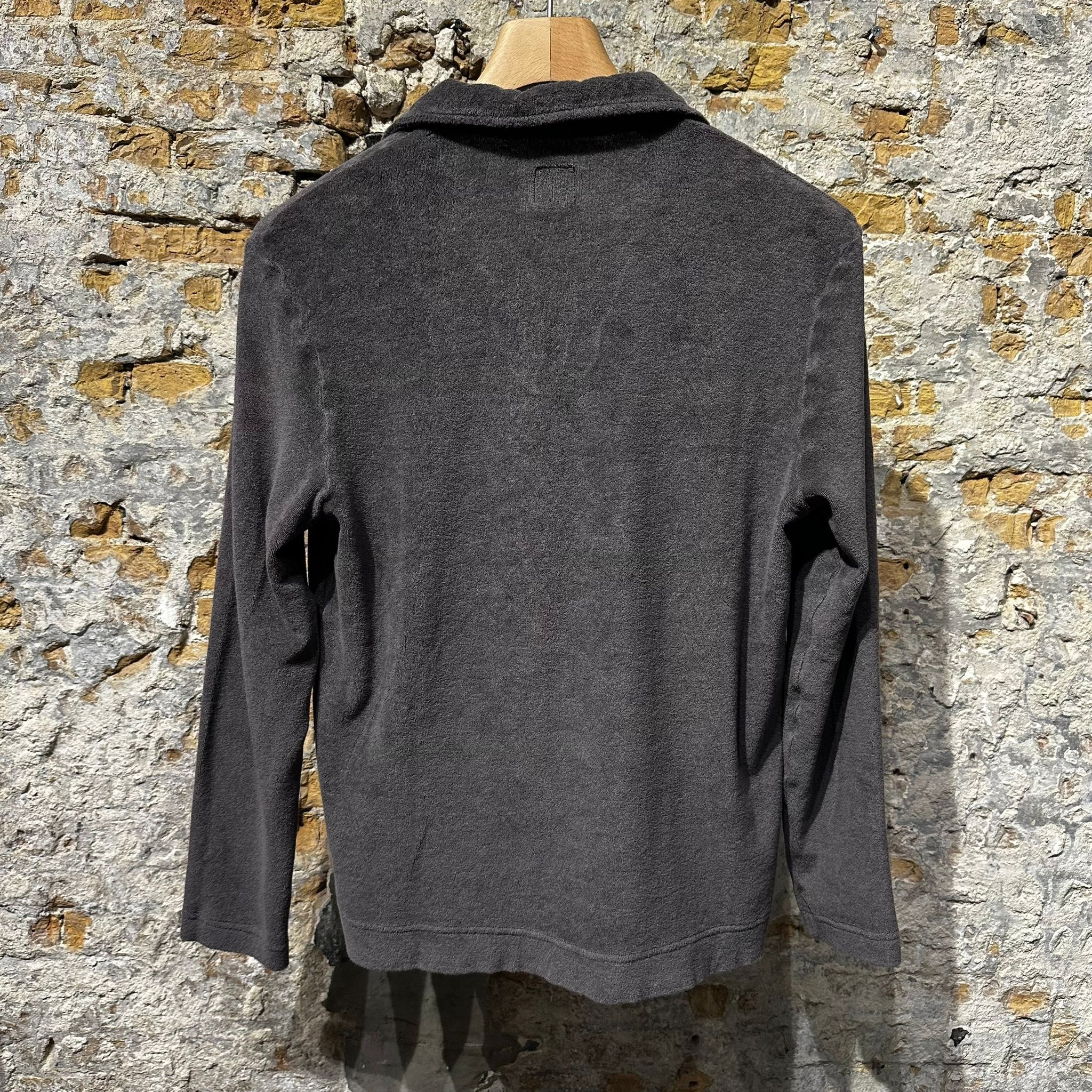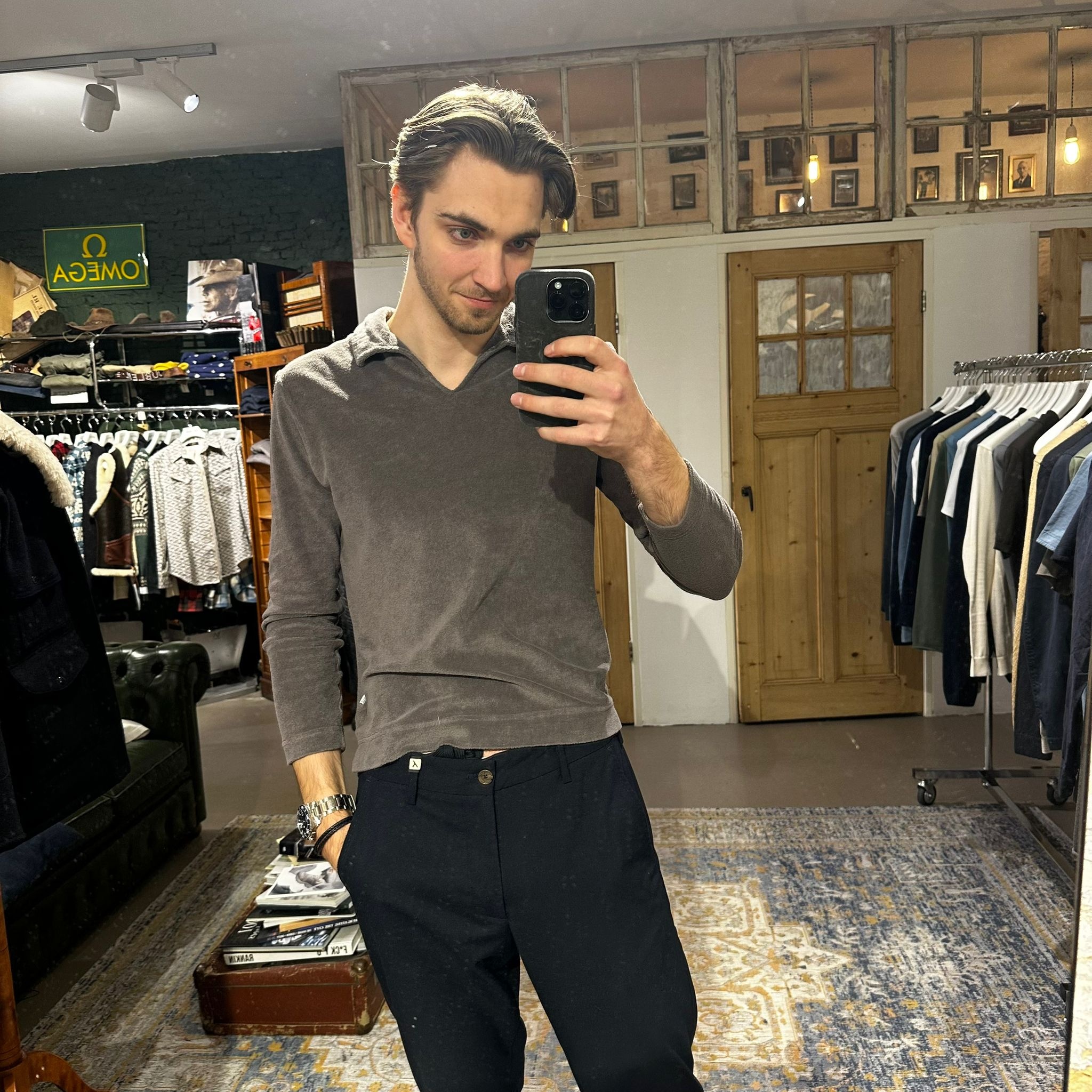 A soft terry-knit sweater in a warm taupe-grey tone, giving it a relaxed and slightly vintage feel.Designed with an open collar and V-shaped neckline, it sits casually on the body while keeping a refined silhouette.