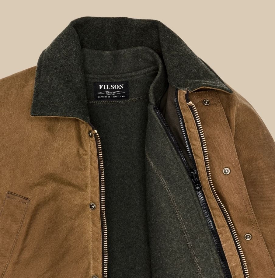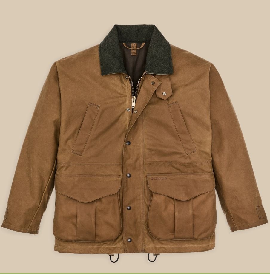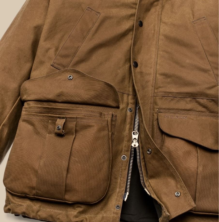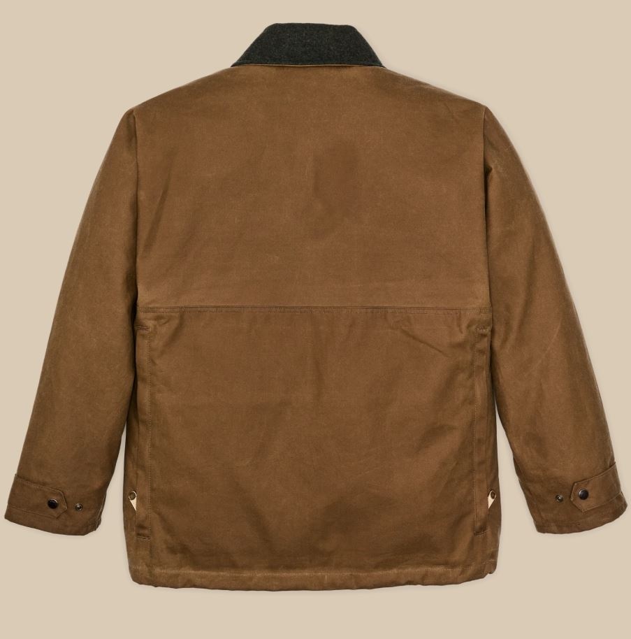 This water-resistant waxed-canvas jacket combines design elements of our proven raincoats with the field functionality of our vintage hunting jackets. It's made with our signature Tin Cloth waxed canvas, the iconic fabric that's provided weather protection in the rain-soaked Pacific Northwest forests for a century. The caped shoulder design minimizes seams exposed to driving rain. Dividers in the expandable front pockets were originally designed to separate live and spent shotgun shells, and work just as well for keeping essentials organized. The zippered back pocket is lined with nylon for carrying game or bulky items. The high-set hand pockets and collar are lined with warm Mackinaw Wool. Select Filson liners can be fastened with the interior zipper. Drawcord-adjustable waist and hem.