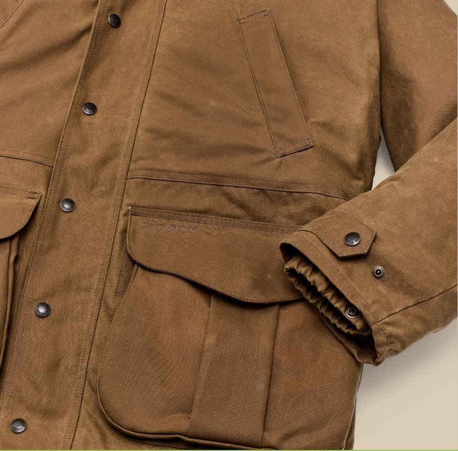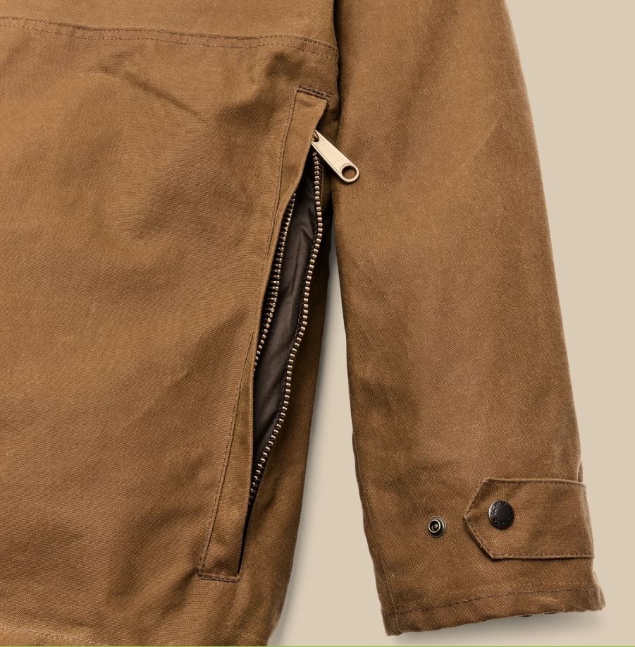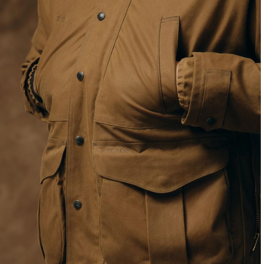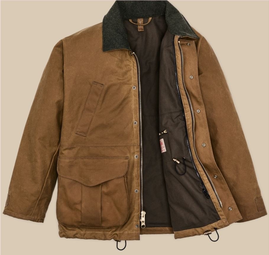 This water-resistant waxed-canvas jacket combines design elements of our proven raincoats with the field functionality of our vintage hunting jackets. It's made with our signature Tin Cloth waxed canvas, the iconic fabric that's provided weather protection in the rain-soaked Pacific Northwest forests for a century. The caped shoulder design minimizes seams exposed to driving rain. Dividers in the expandable front pockets were originally designed to separate live and spent shotgun shells, and work just as well for keeping essentials organized. The zippered back pocket is lined with nylon for carrying game or bulky items. The high-set hand pockets and collar are lined with warm Mackinaw Wool. Select Filson liners can be fastened with the interior zipper. Drawcord-adjustable waist and hem.