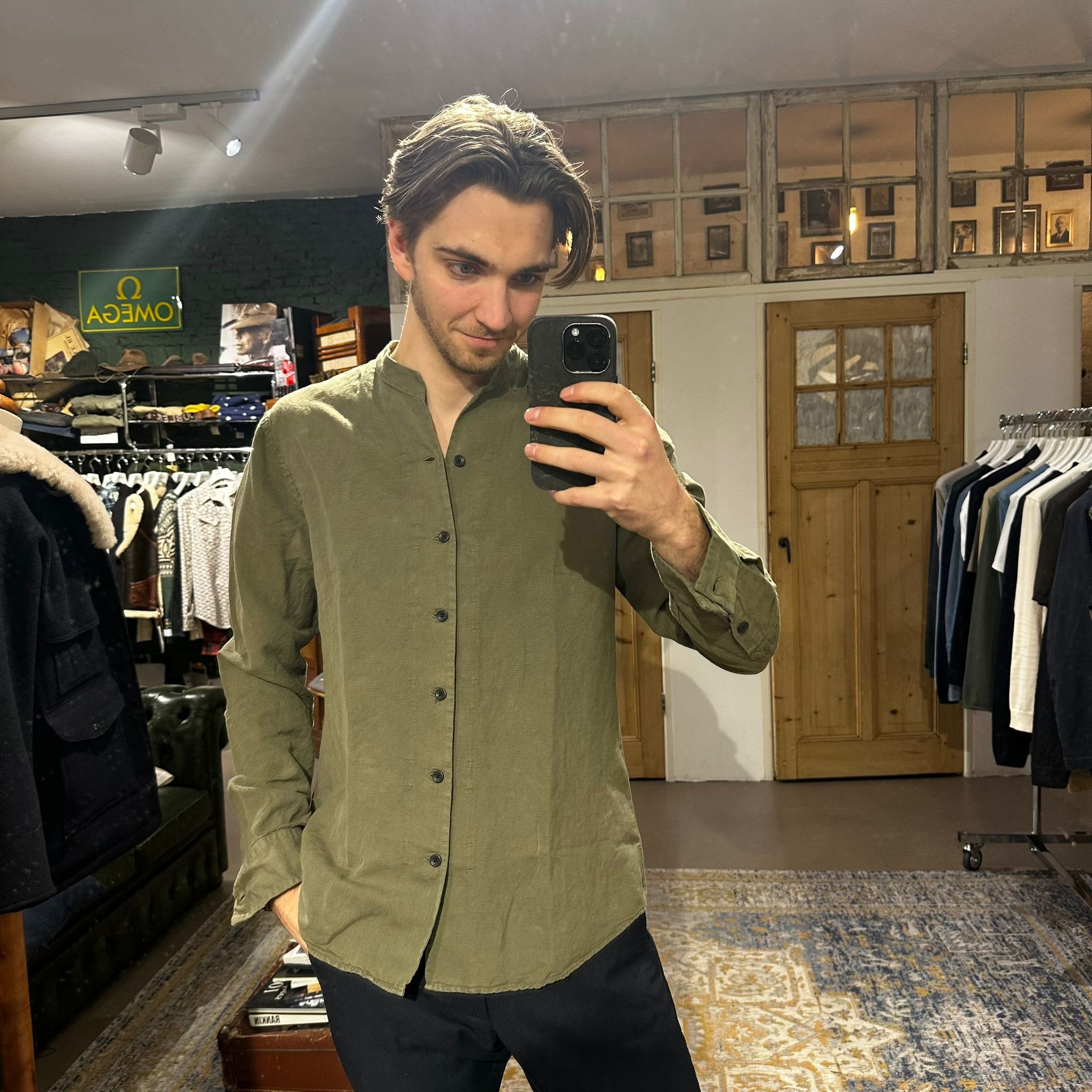 This shirt is cut in a clean, relaxed silhouette with a soft stand collar that gives it a slightly more refined feel than a classic button-down.