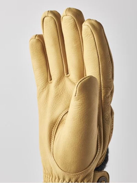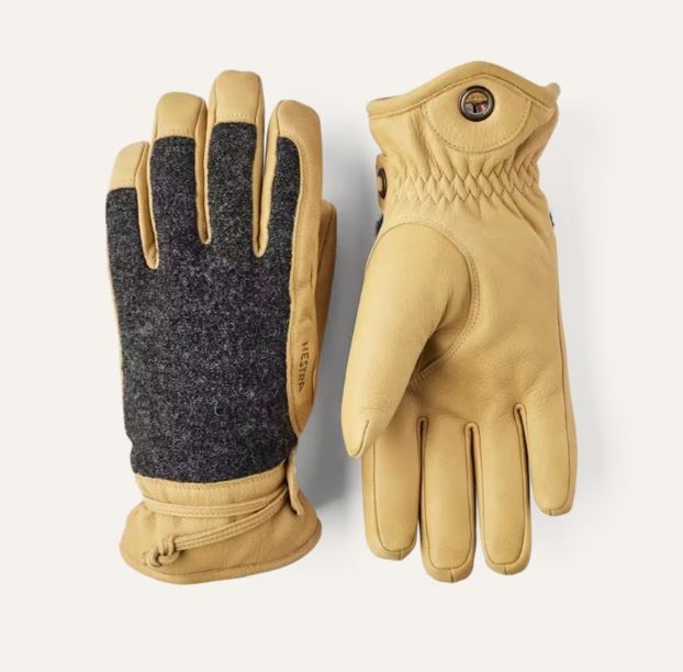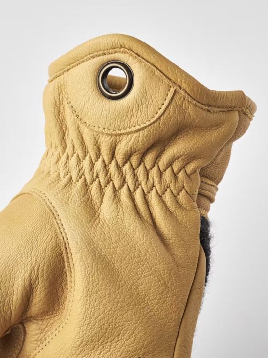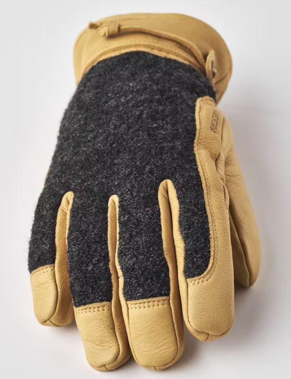 A timeless leather glove with warming Primaloft insulation and the backhand in Swedish-made felted wool for a rustic feel. This classic Hestra design has been updated with new materials and practical details – such as a handy leather strap to adjust the wrist and an eyelet that lets you attach the glove to a bag or rucksack. The pre-curved fit and the combination of wool, synthetic insulation and a brushed fleece lining make this glove extra warm and comfortable. The palm, fingers and cuff are in soft, hardwearing goatskin that naturally shapes itself to the hand.