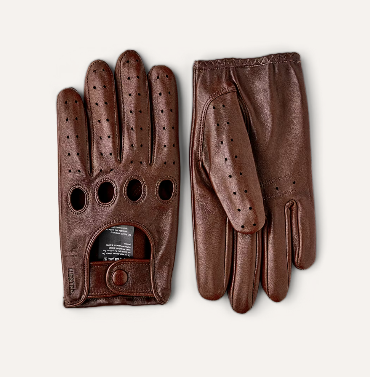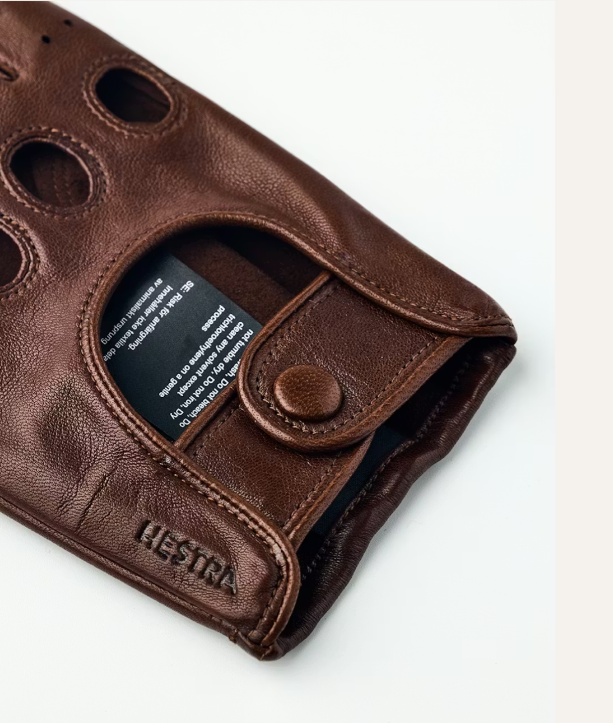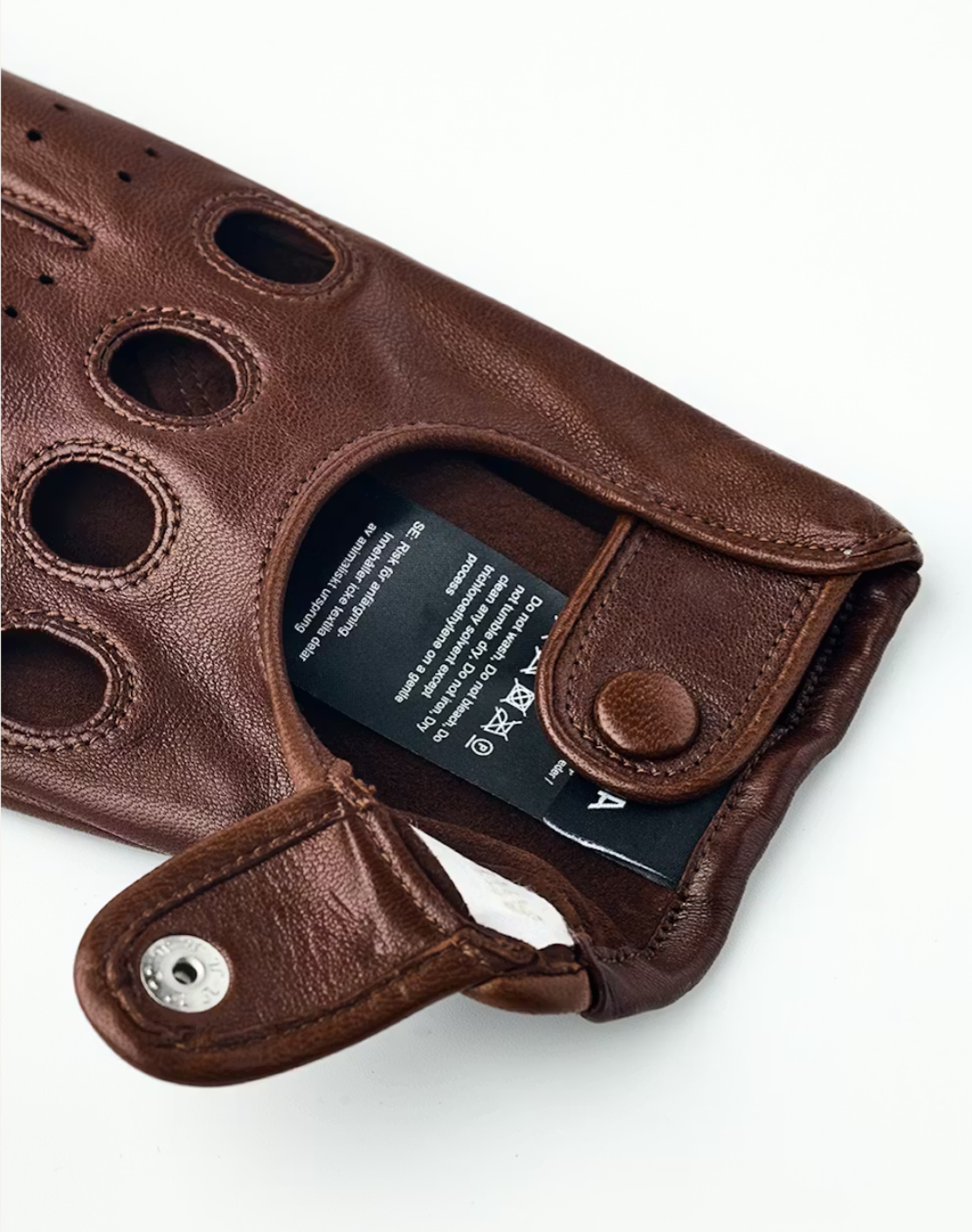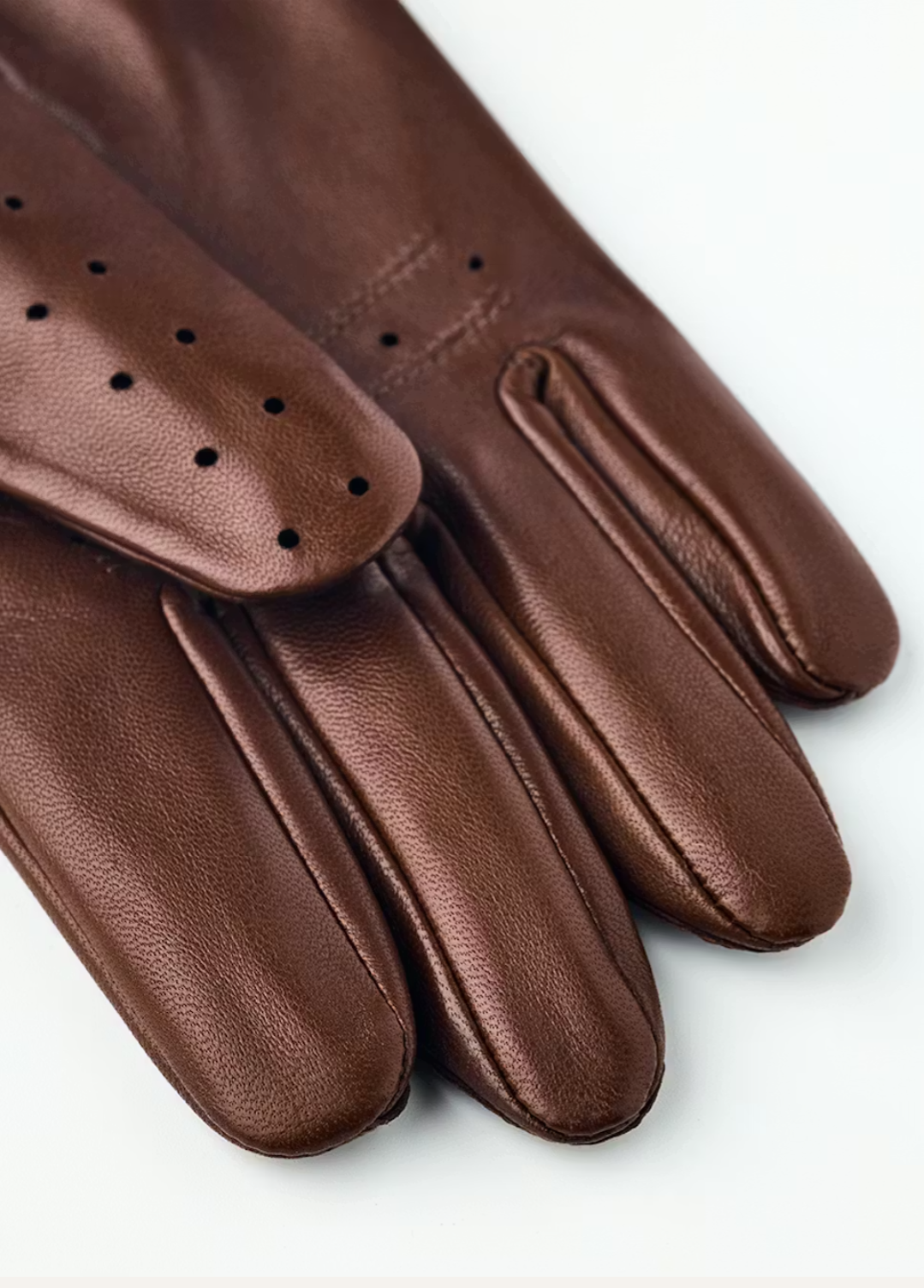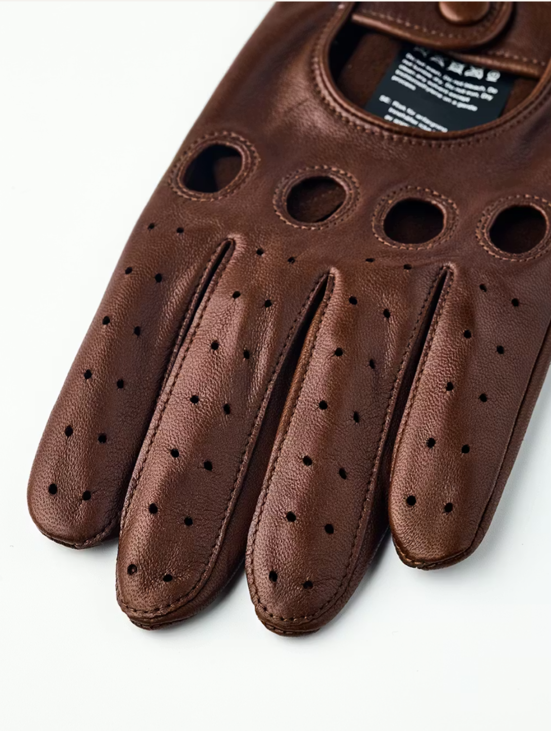 Thin glove in exclusive Italian lambskin nappa leather with a beautiful sheen. A classic so-called “driving glove” with a 1960s-inspired look. Top-quality materials and craftsmanship, with half-piqué seams around the fingers and punched holes over the knuckles. Close-fitting, with a press stud for a snug fit around the wrist. With an open back and perforated fingers, it is perfect for spring and summer. Even if you can’t run to an open-top sports car, you can still enjoy an air of sporty elegance.