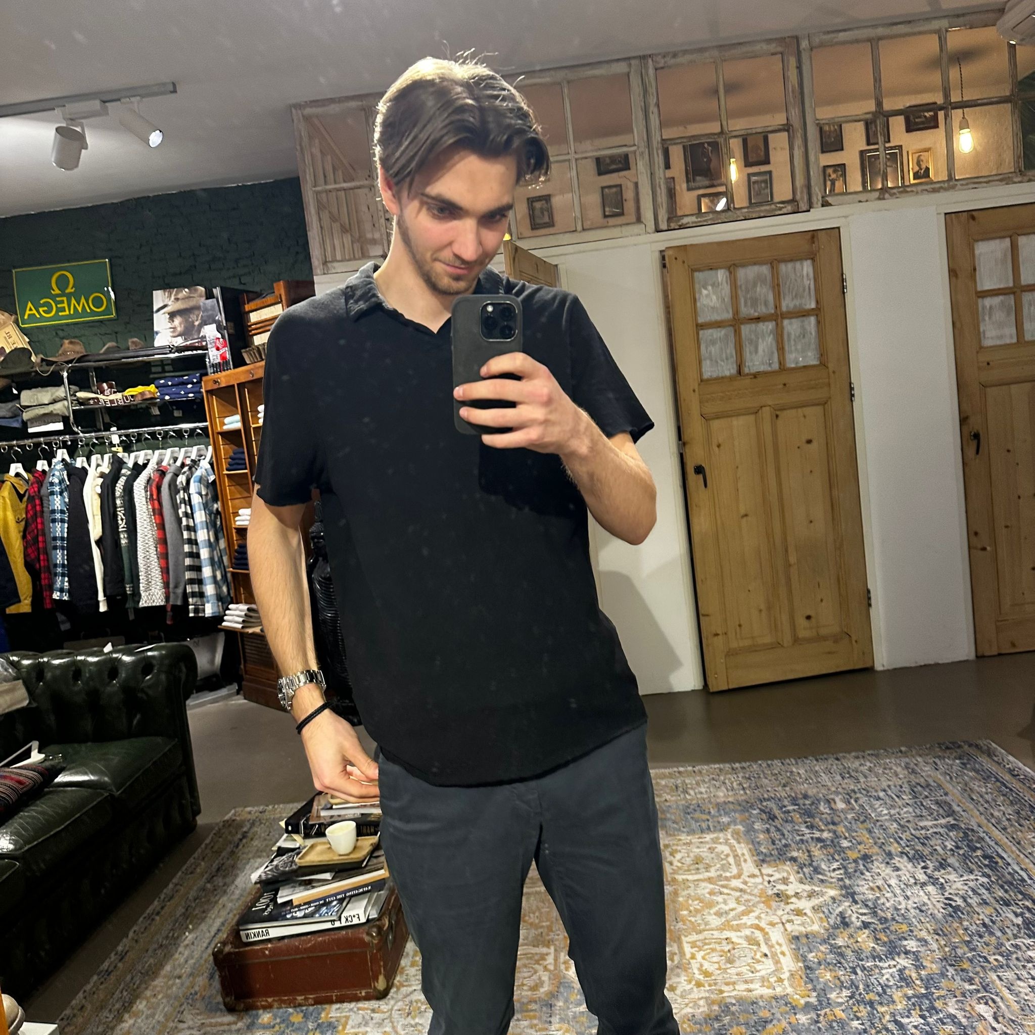 In timeless black, this James Perse polo delivers effortless sophistication with a distinctly modern attitude. The clean, open collar creates a relaxed yet refined silhouette, offering a subtle alternative to the classic buttoned polo. Minimalist in design, it reflects the brand’s philosophy: luxury expressed through fabric, fit, and finish rather than logos.