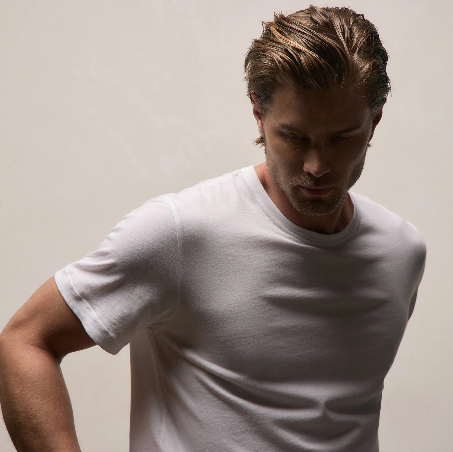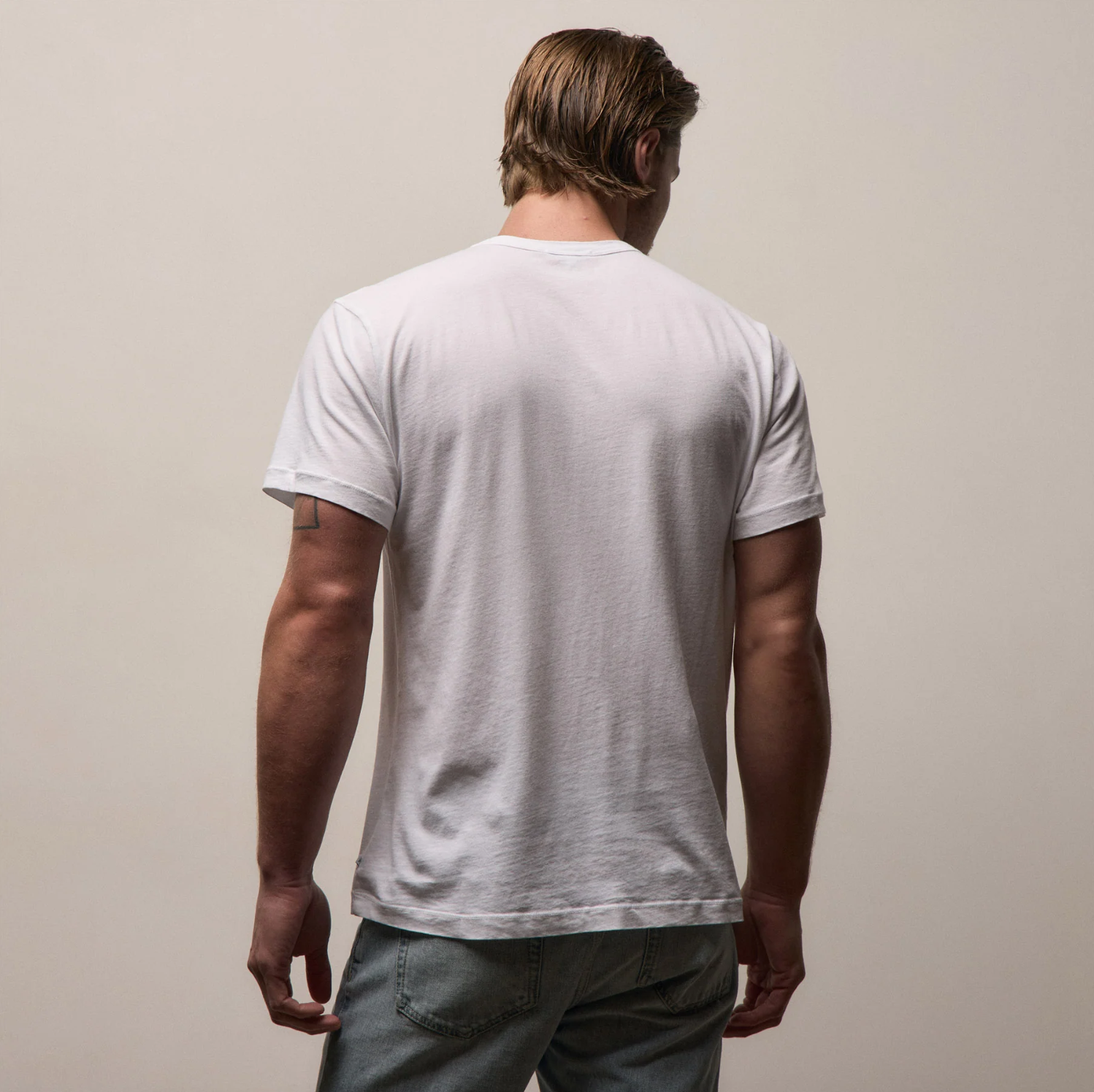 Crafted in 100% cotton jersey from the US, this tee has a soft, lived-in feel achieved through fiber treatment and garment dyeing. It features a bound neck, clean finished hems, and a classic fit. Made in USA.