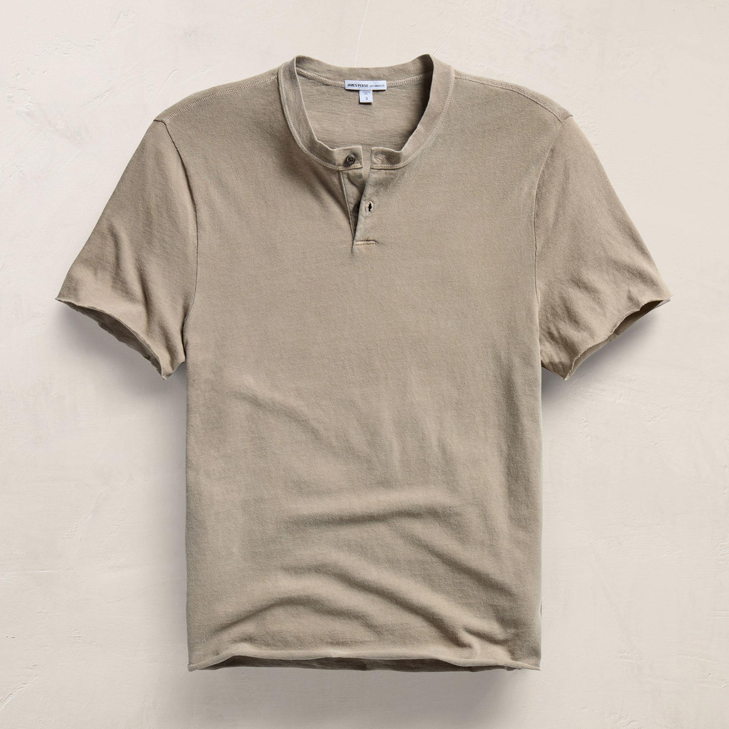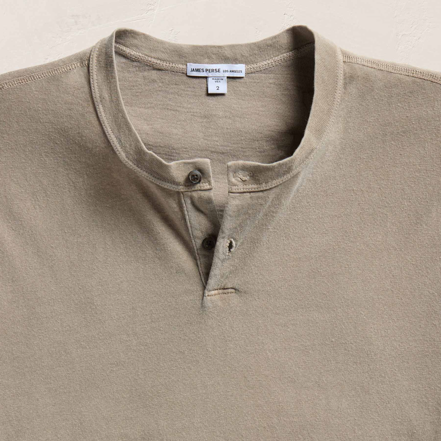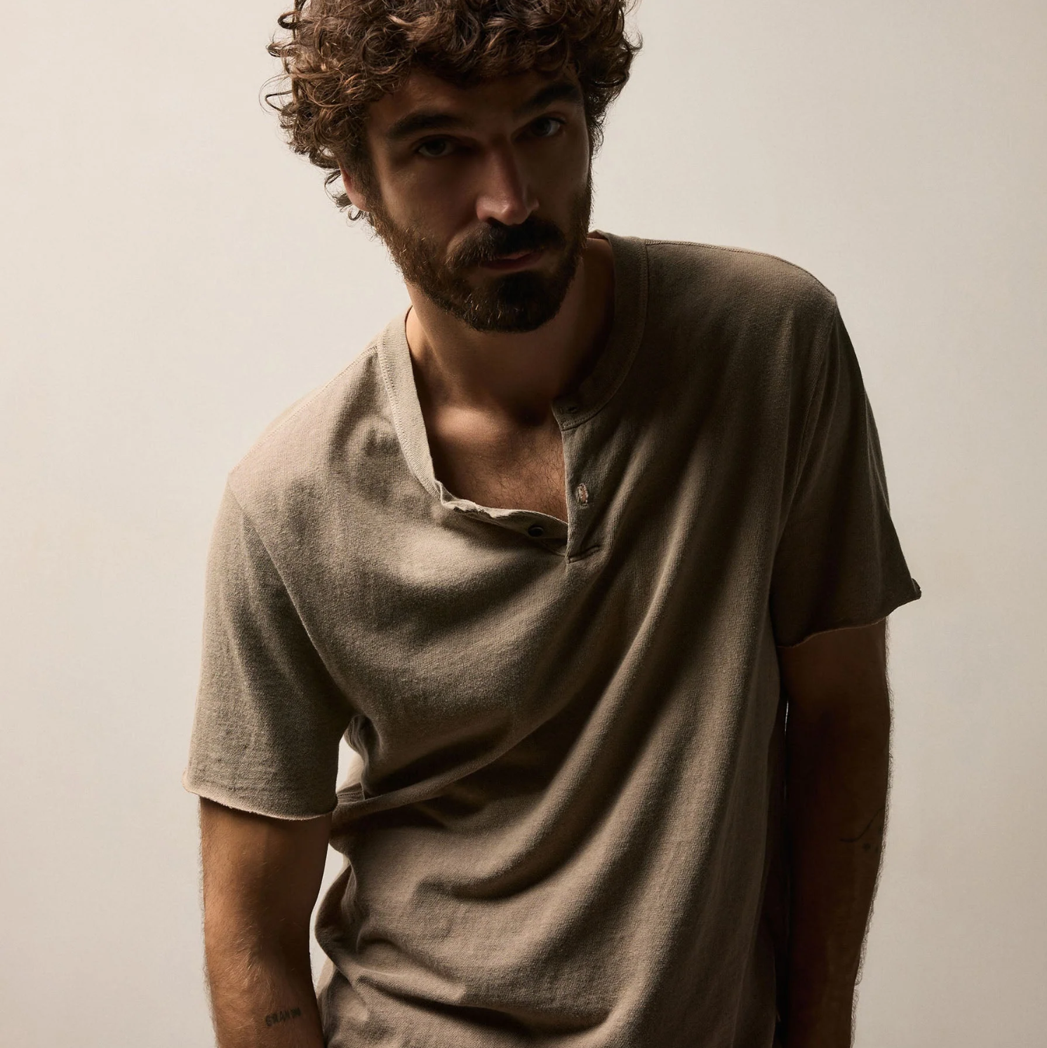 Made in Japanese jersey that is soft with a lofty gauze effect, it has natural slub with high's and low's. Binded crew neck, short sleeves, two button placket and raw edge bottom & sleeve