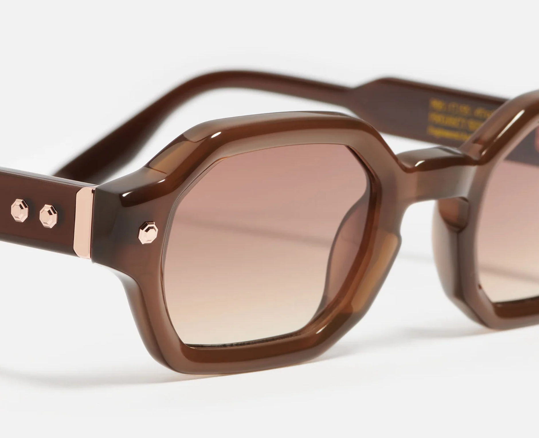 Brown acetate. Corewire, decorative elements in rose gold colored stainless steel.