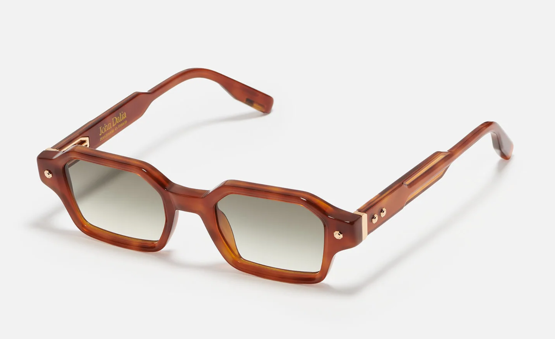 Project 09 is a unisex frame crafted from an 8mm acetate sheet. It features a rectangular shape, a signature John Dalia armature and hinges, as well as decorative pins.