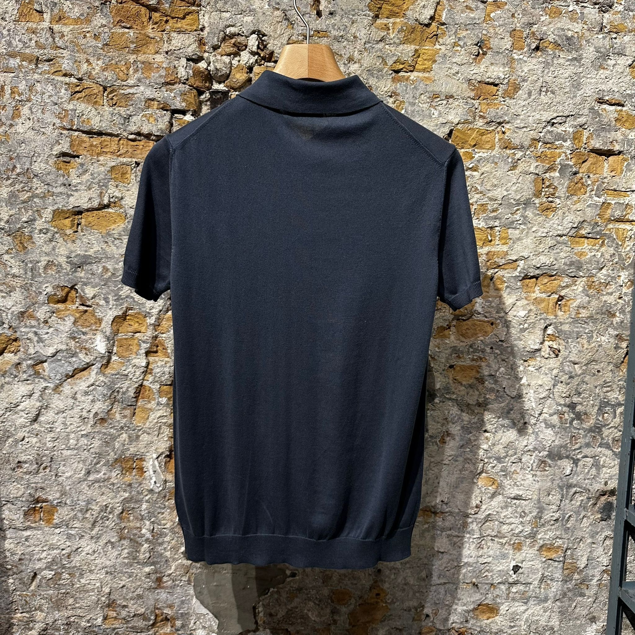 A sleek short-sleeve polo in a versatile charcoal grey tone, finished with a clean three-button placket and softly structured collar. The fine knit texture and ribbed hem create a sharp, tailored silhouette that sits neatly at the waist.