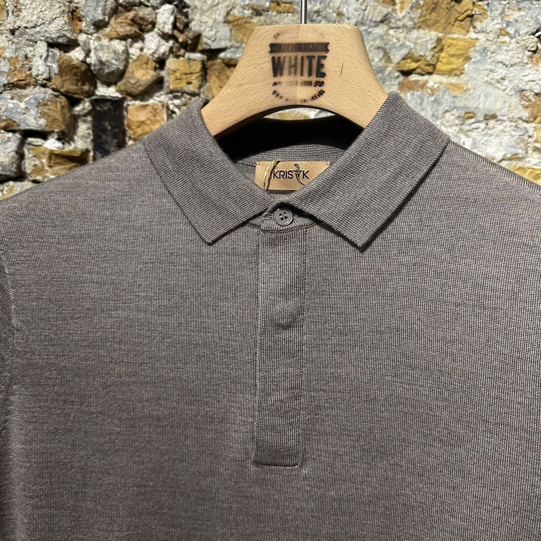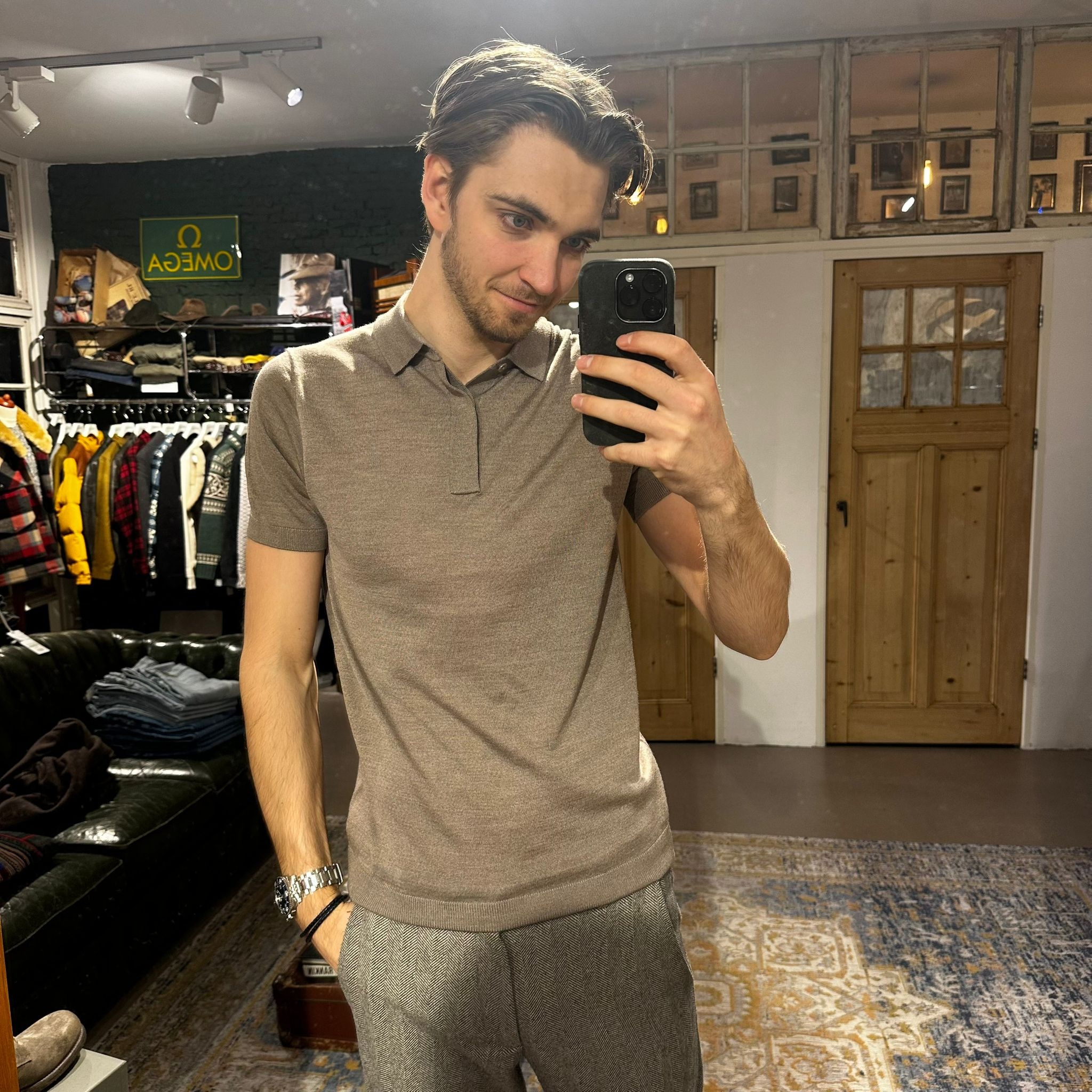 A refined essential in a versatile taupe tone, crafted from a fine, lightweight knit that feels soft and breathable against the skin. The clean button placket and structured collar give it a sharp, understated character.