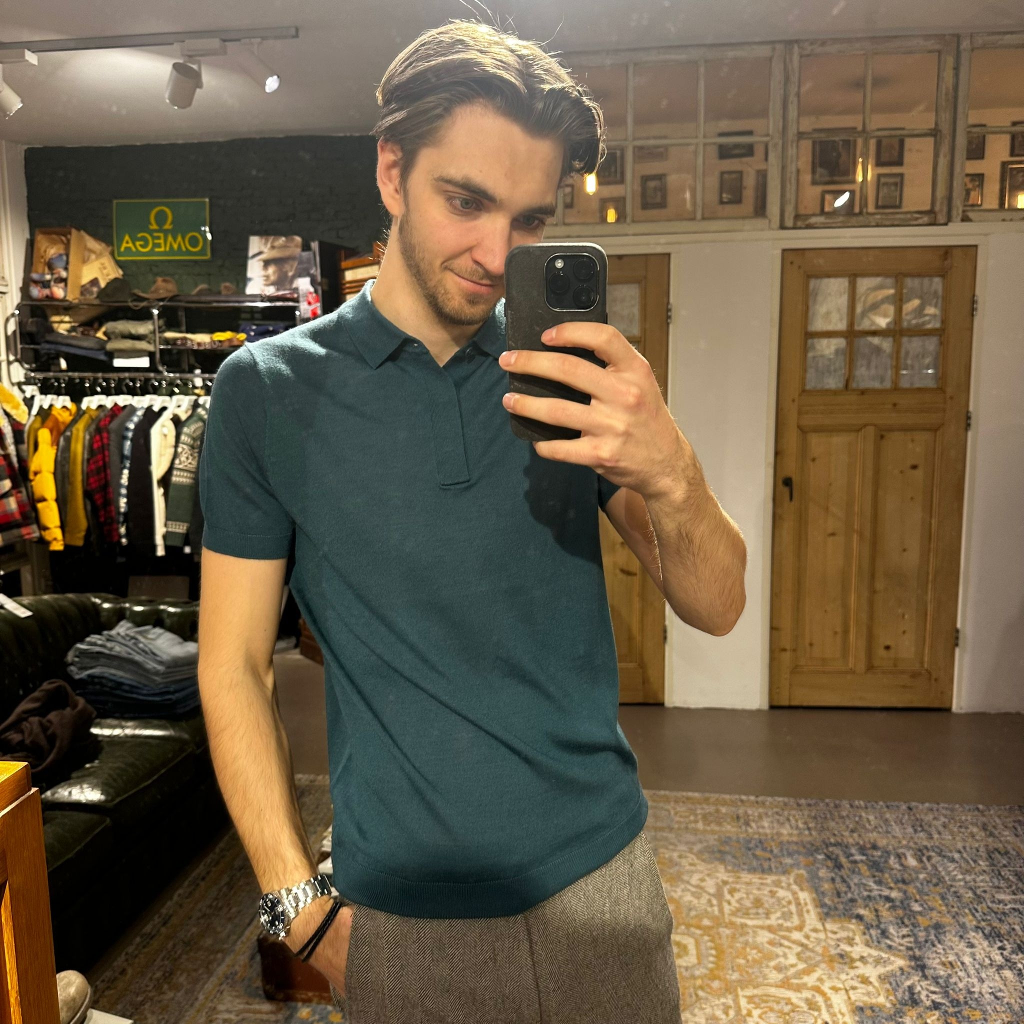 A sophisticated knit polo in a rich deep teal tone, crafted from a fine, lightweight yarn that feels smooth and breathable. The minimalist placket and sharp collar give it a clean, contemporary look.