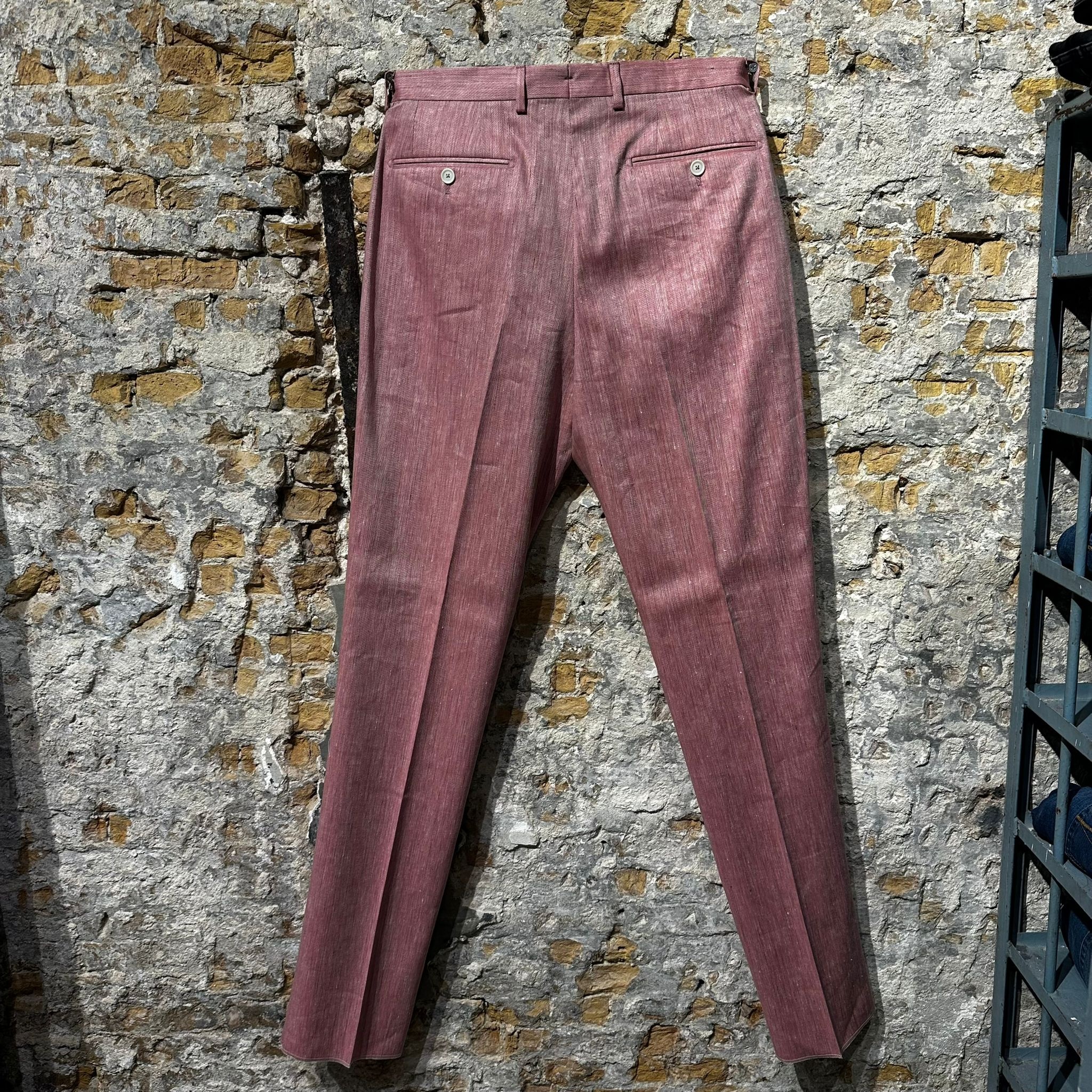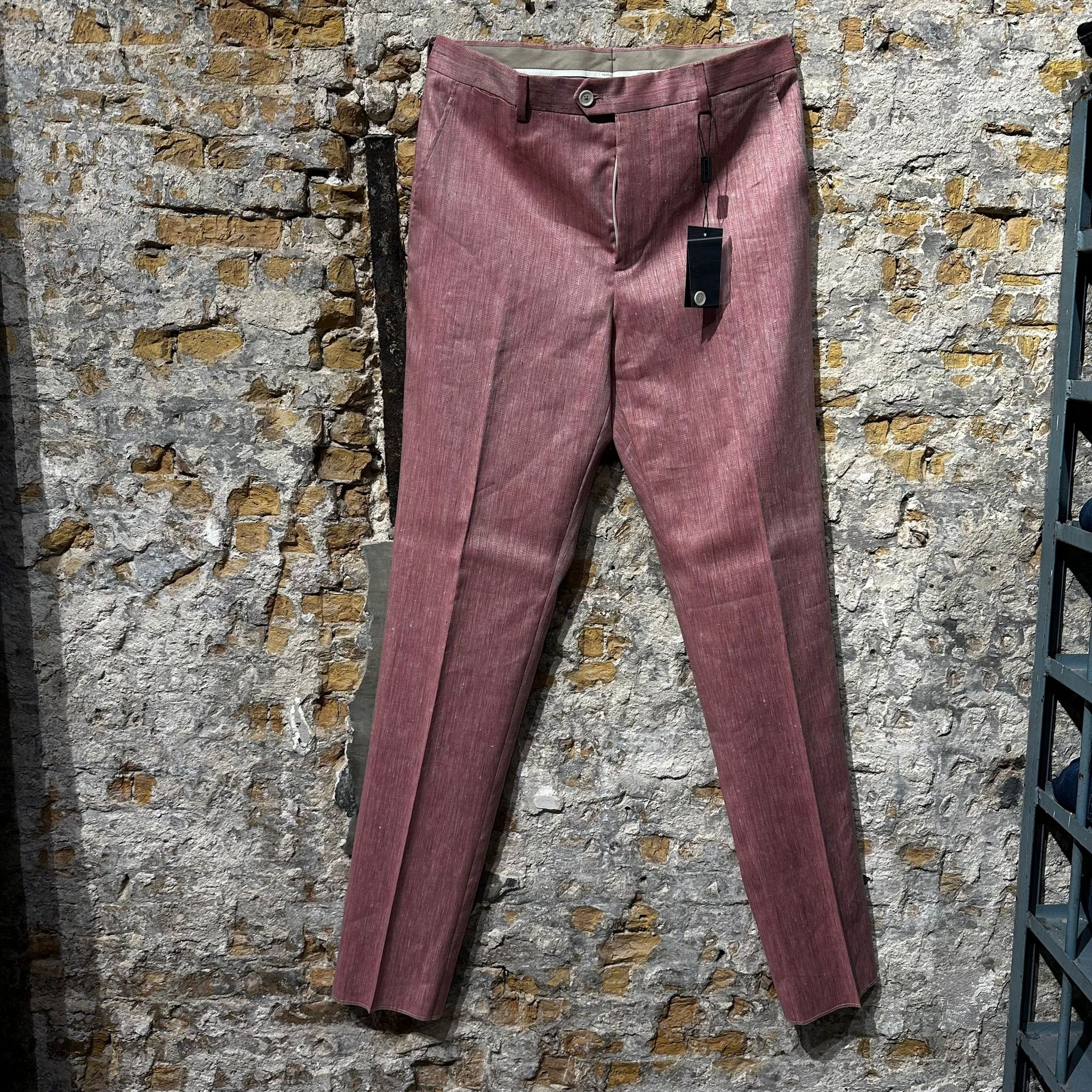 A refined pair of tailored trousers in a distinctive rose tone, designed to bring character to modern suiting. The clean front, sharp crease, and slim silhouette create a streamlined, elegant profile.