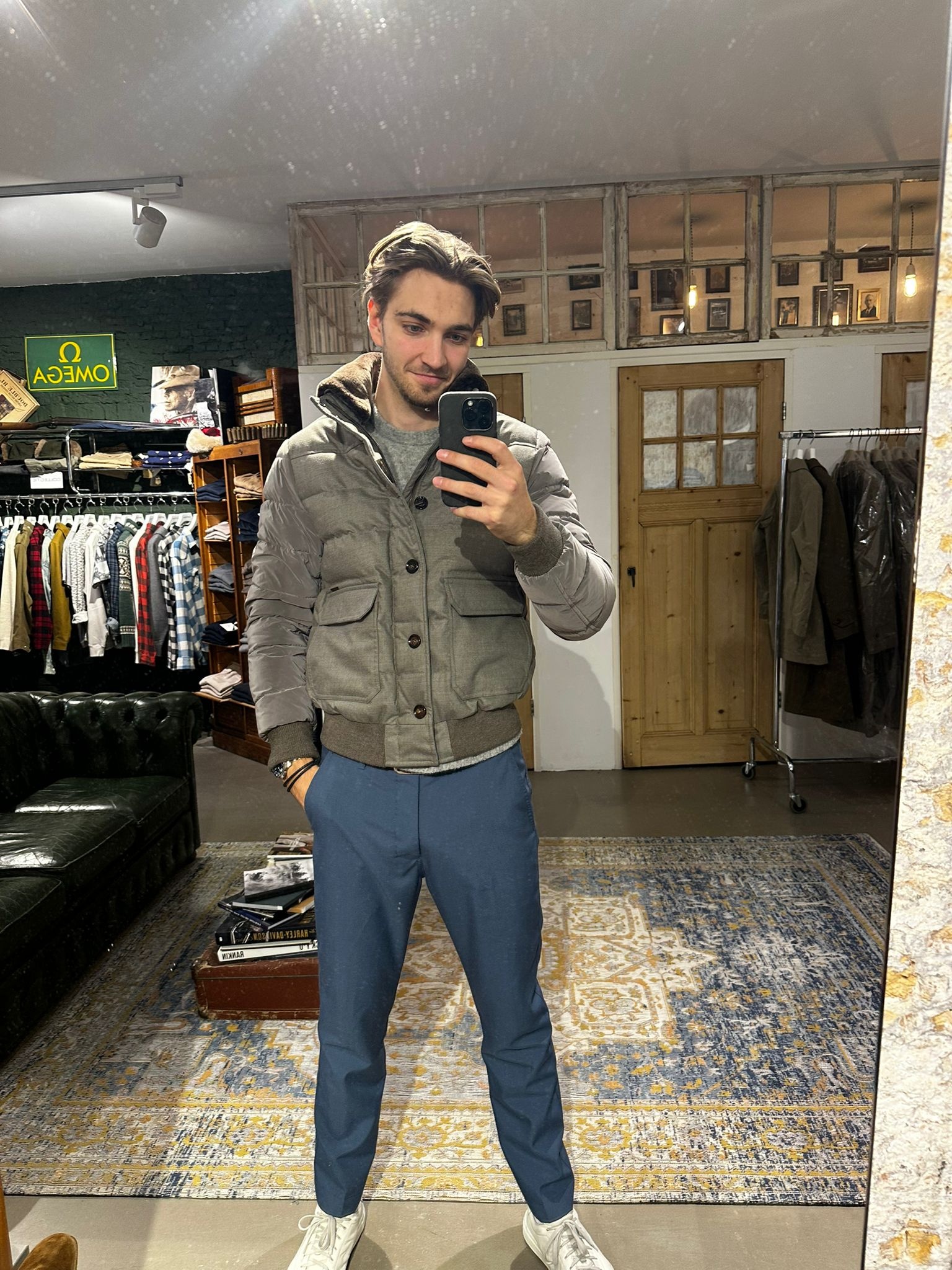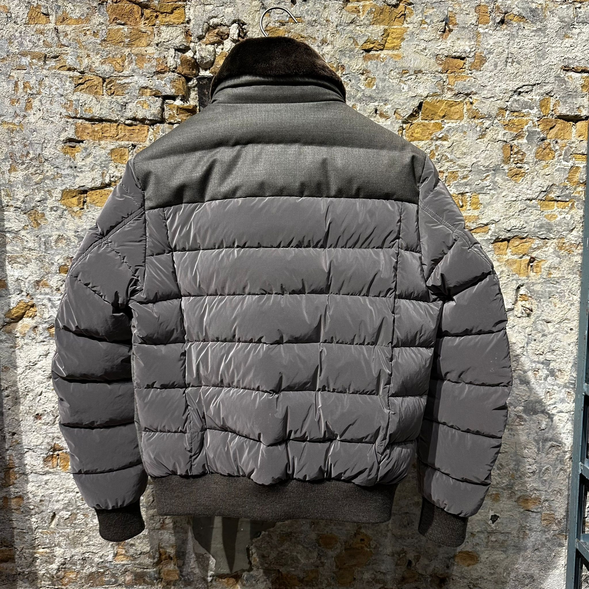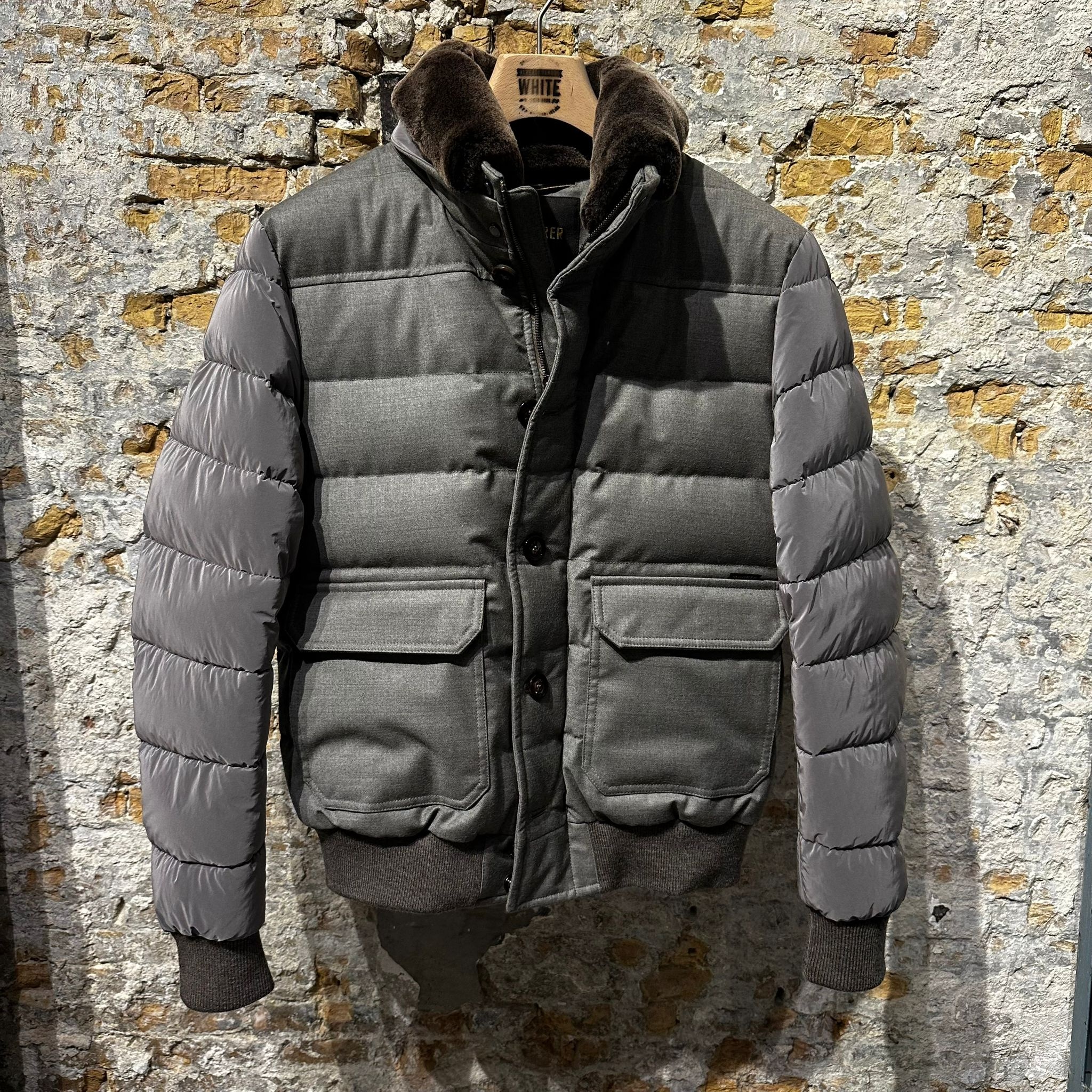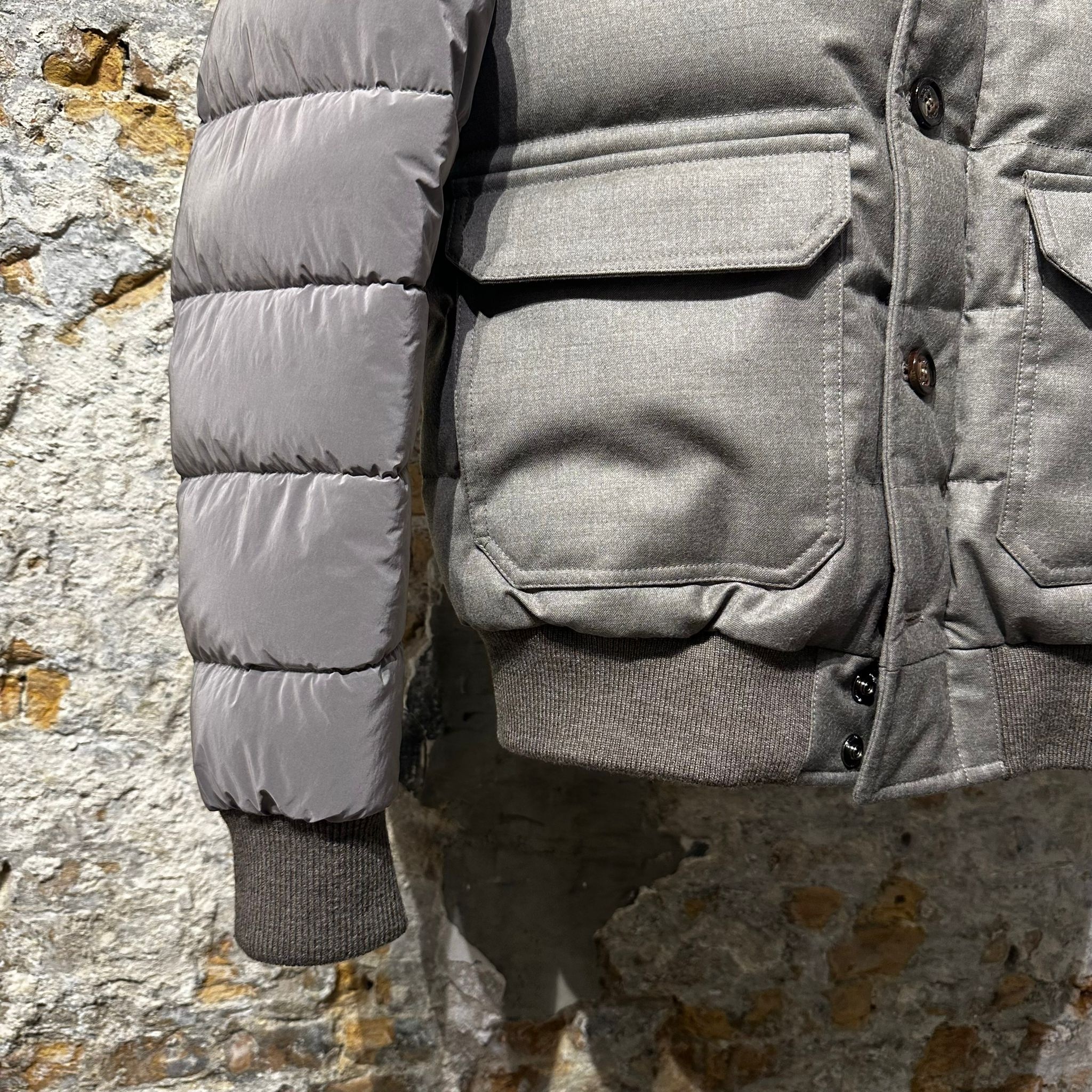 A sleek, quilted jacket with glossy sleeves and a soft lined collar. Finished with flap pockets, ribbed trims, and Italian craftsmanship. Warm, versatile, and effortlessly sophisticated.