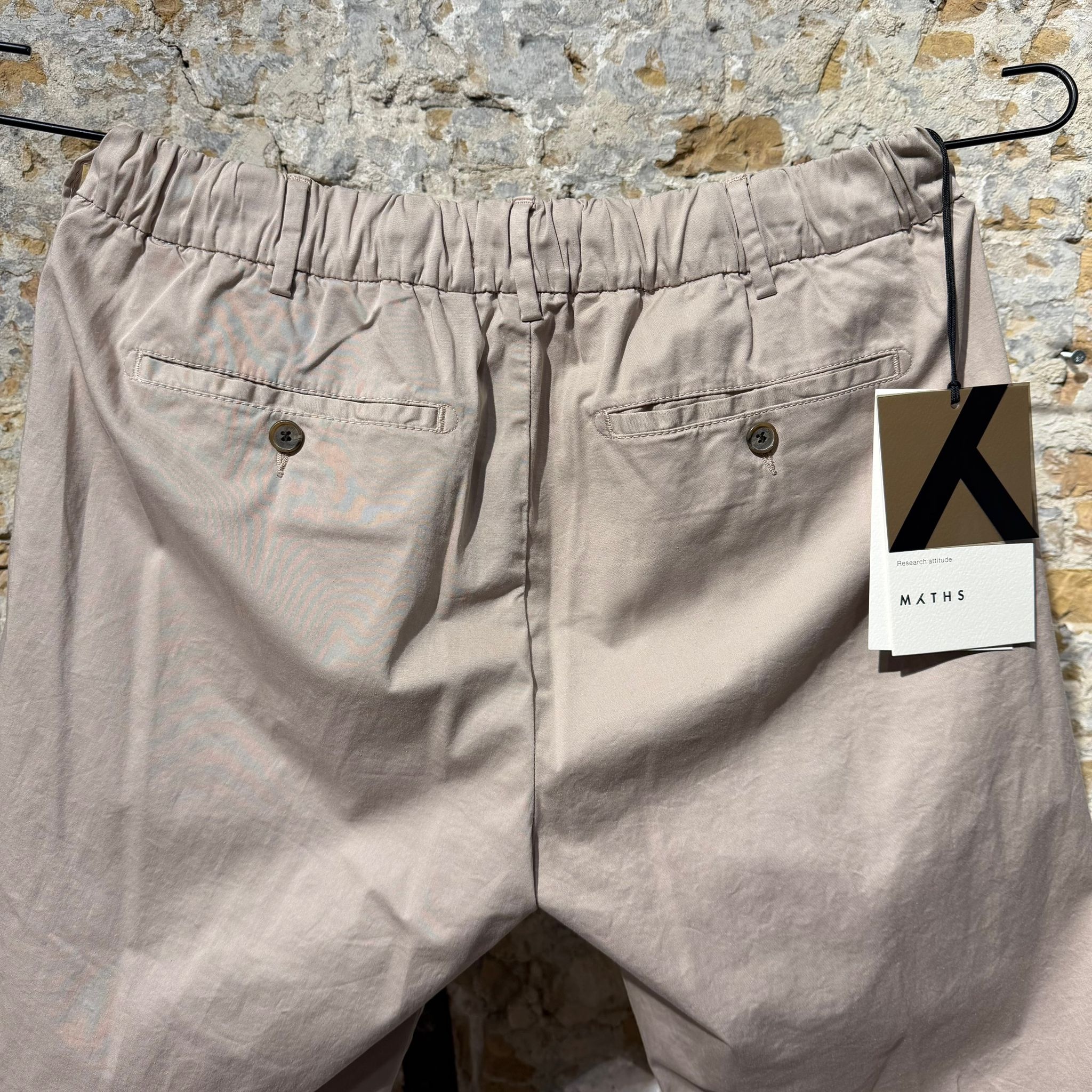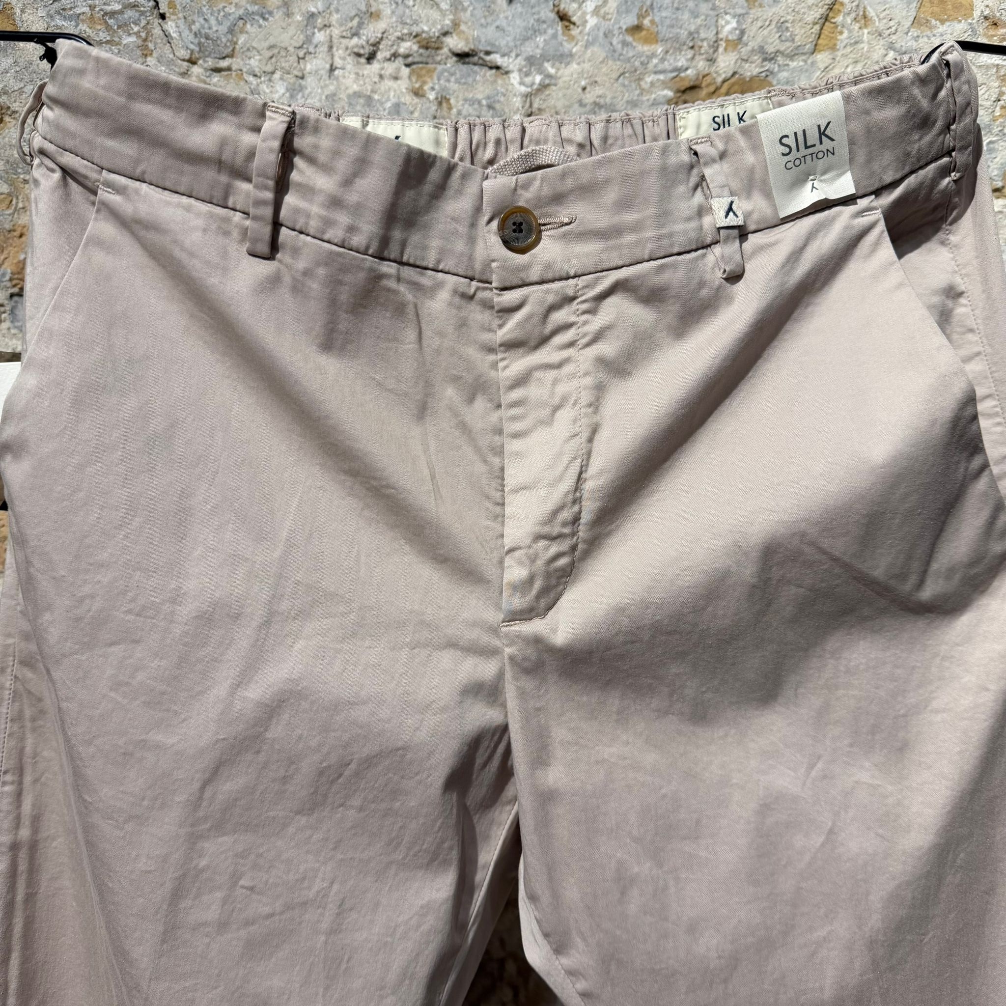 Lightweight trousers crafted from a refined silk-cotton blend, combining comfort with a clean, contemporary look. The fabric has a smooth hand feel and subtle sheen, offering breathability and softness while maintaining structure. Designed with a relaxed waistband featuring elastic at the back and adjustable drawstrings for a comfortable fit. Finished with belt loops, a button closure, and classic welt pockets at the back. An effortless piece that works equally well with knitwear, shirts, or lightweight jackets.