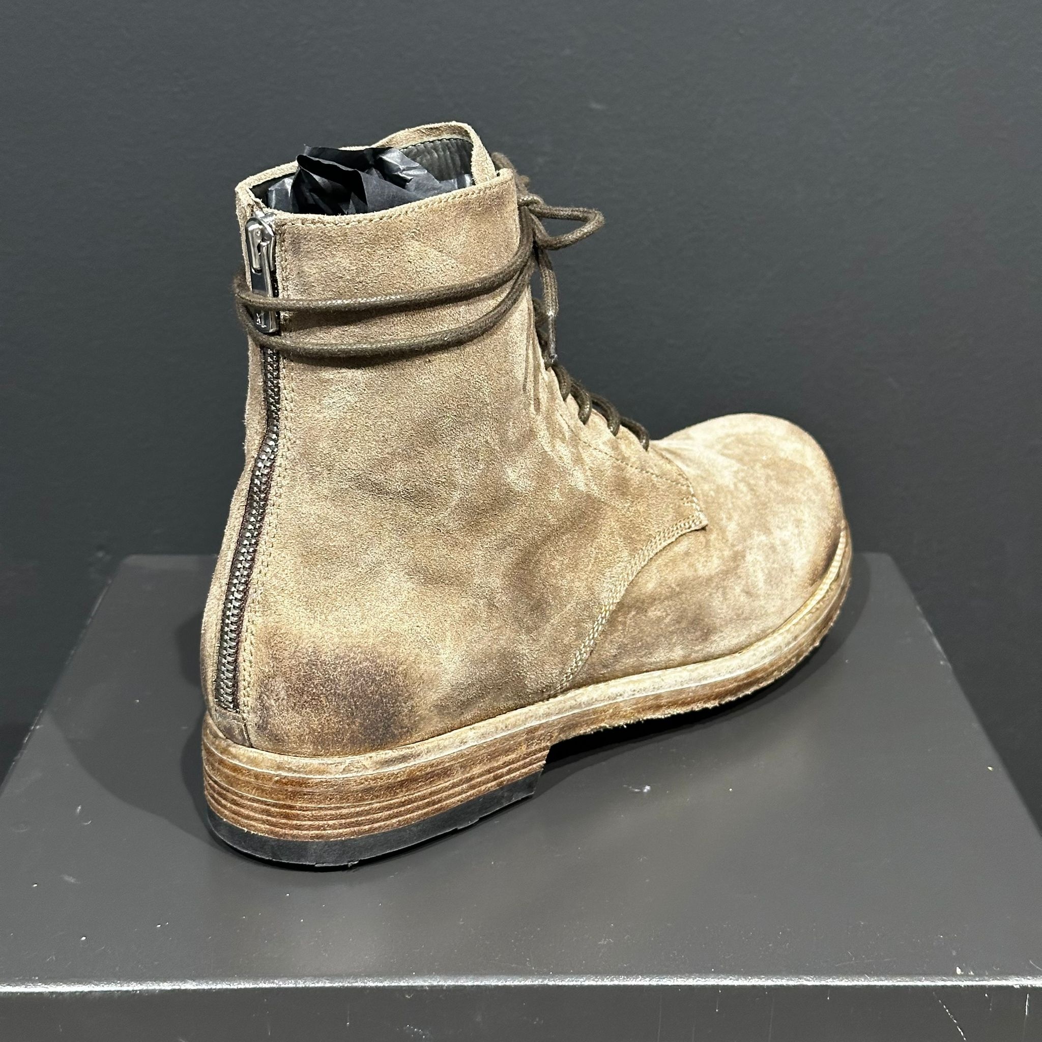 The Bulla DD 102 boots harmoniously unite form and function. Crafted in Italy from durable green suede, they undergo a series of intricate manual processes, including a deep dye treatment, which gives them a unique 3D character.