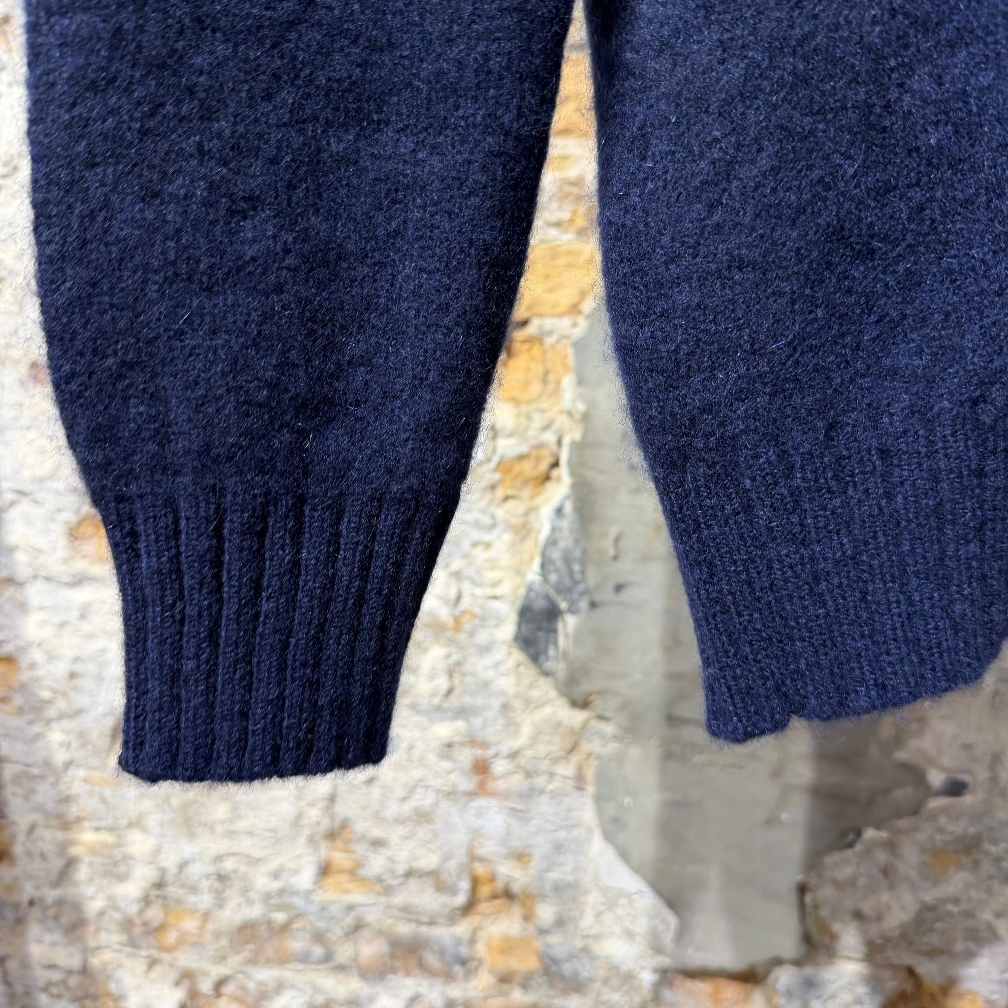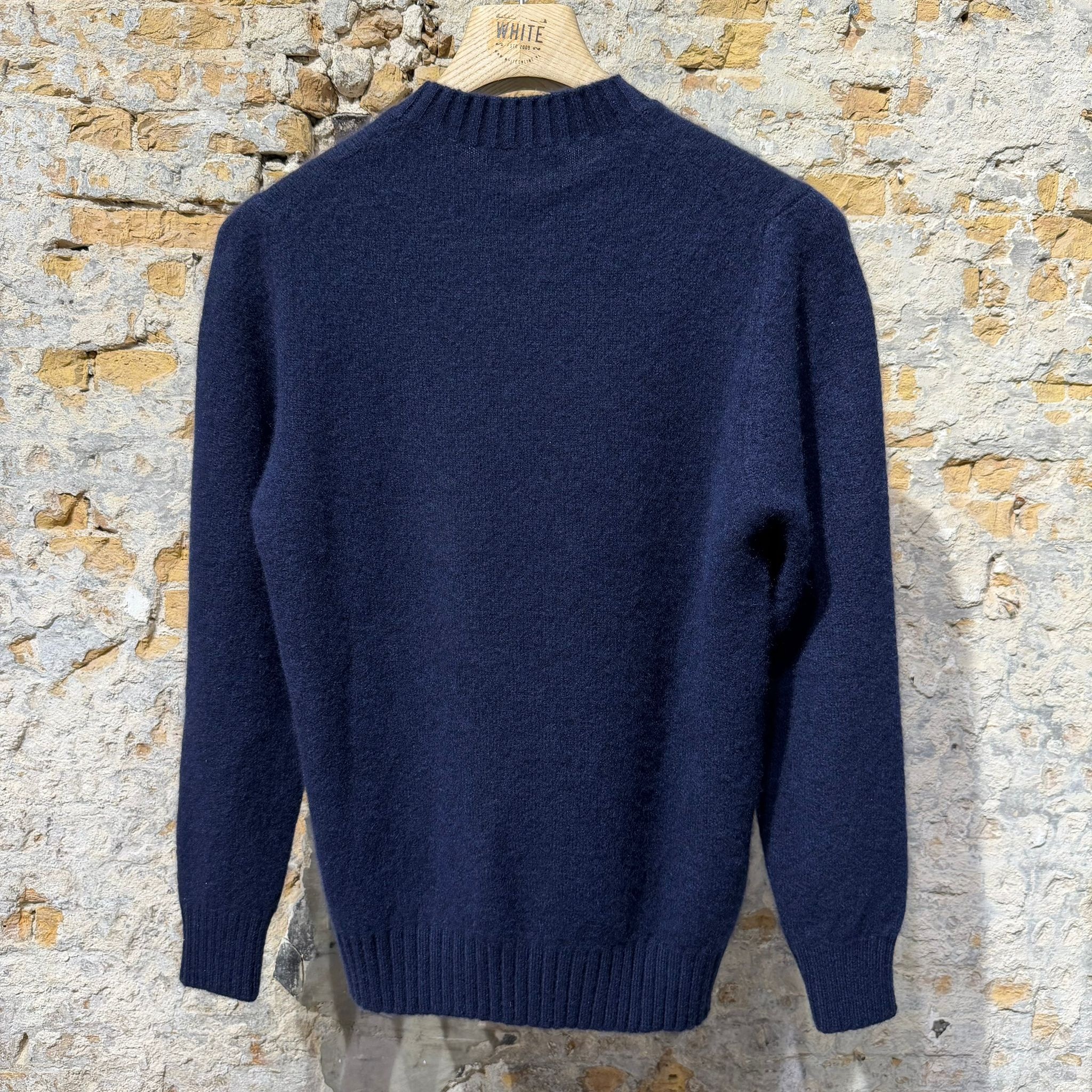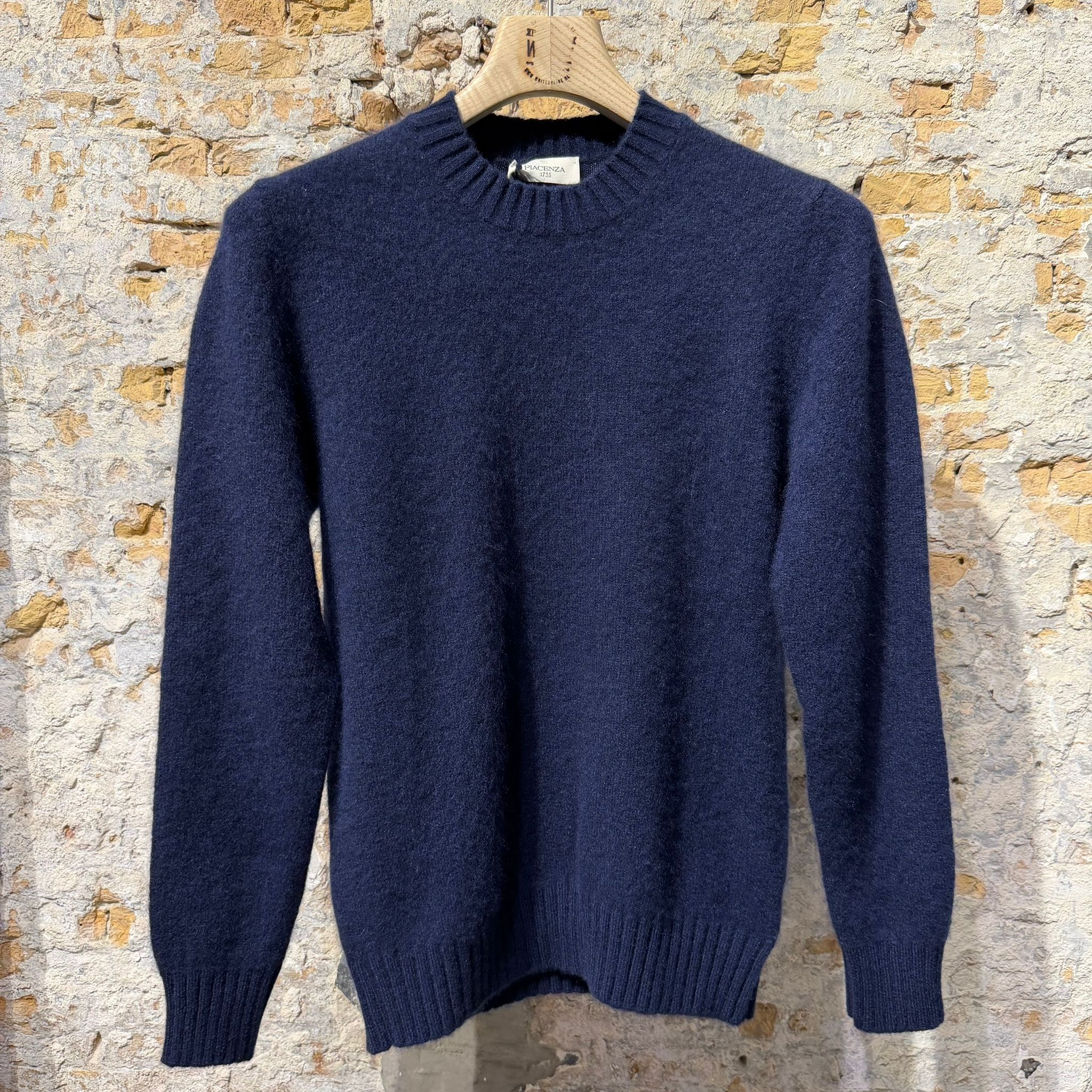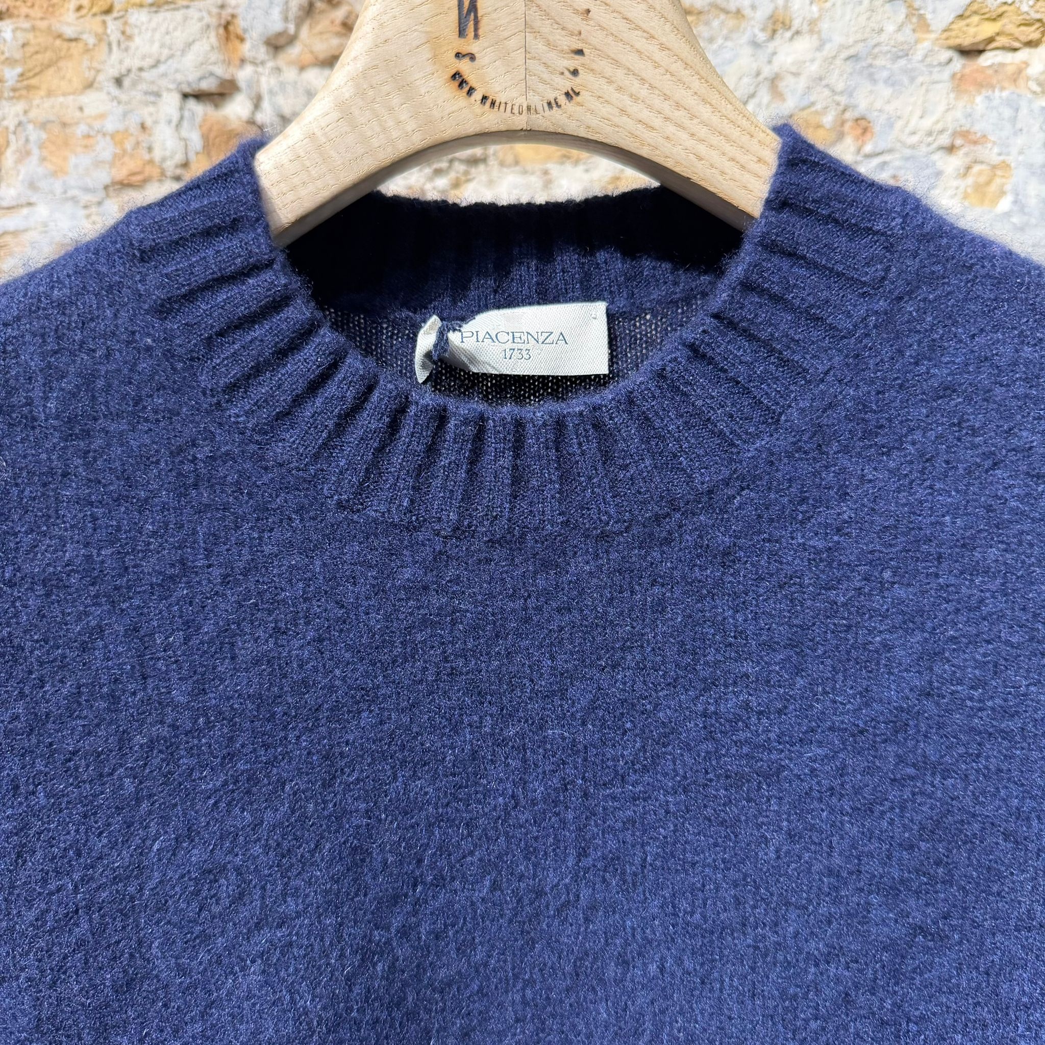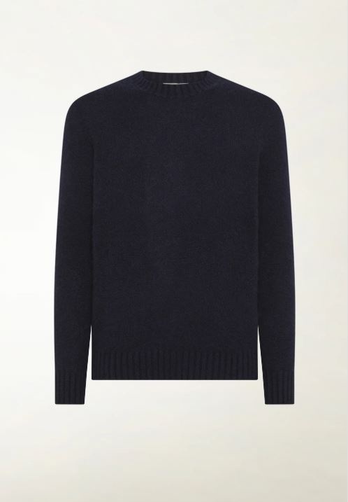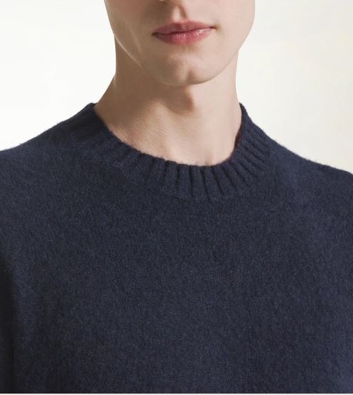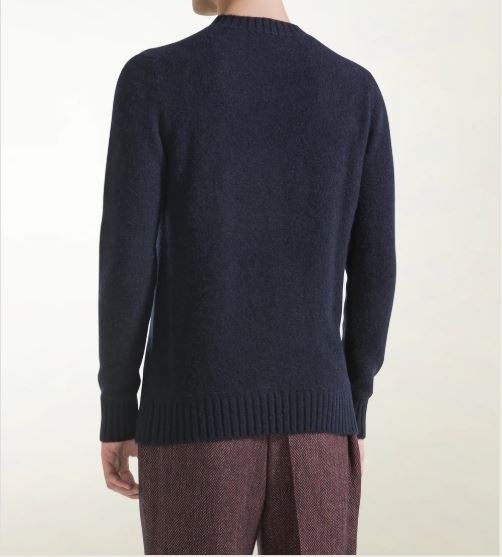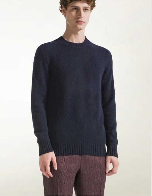 Crew neck sweater with long sleeves and ribbed trim on the collar, cuffs and hem in blue, made from a yarn composed of 71% cashmere, 19% silk and 10% polyester, worked in a 7 gauge Plain Stitch, a regular stockinette stitch that enhances the simplicity of the design and the balance between softness and structure.