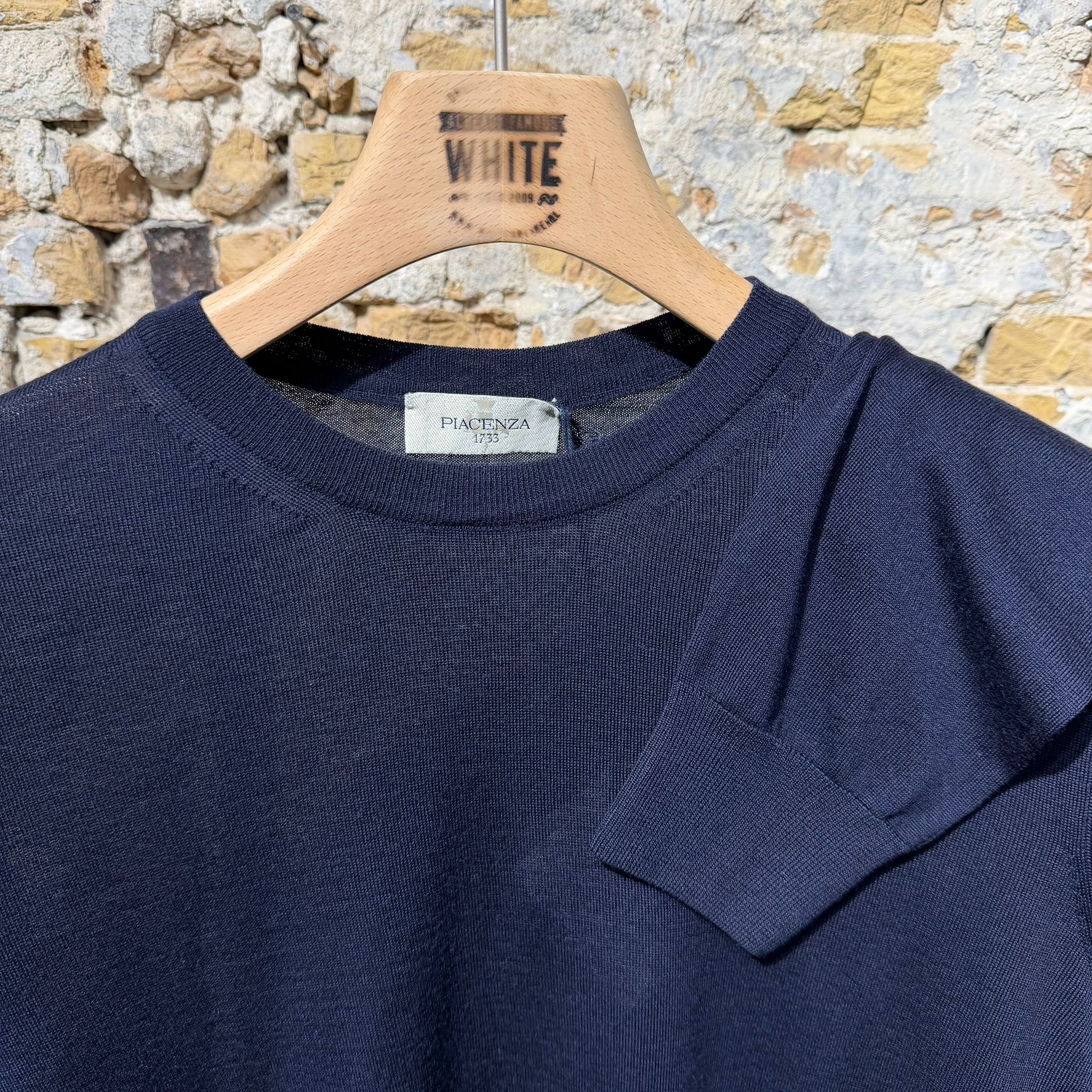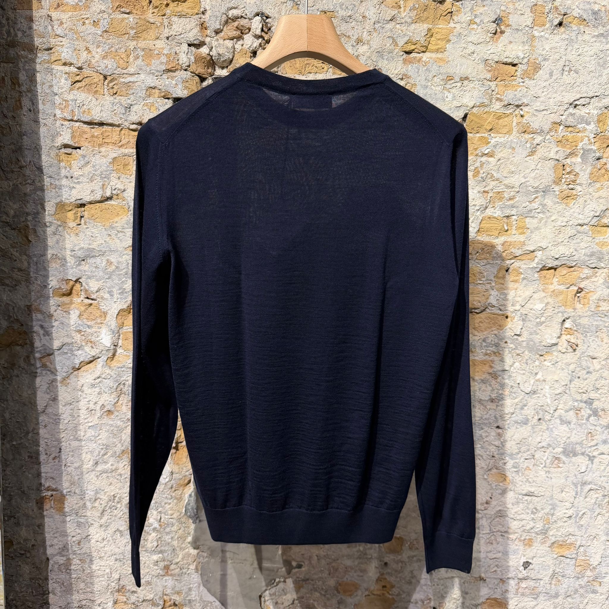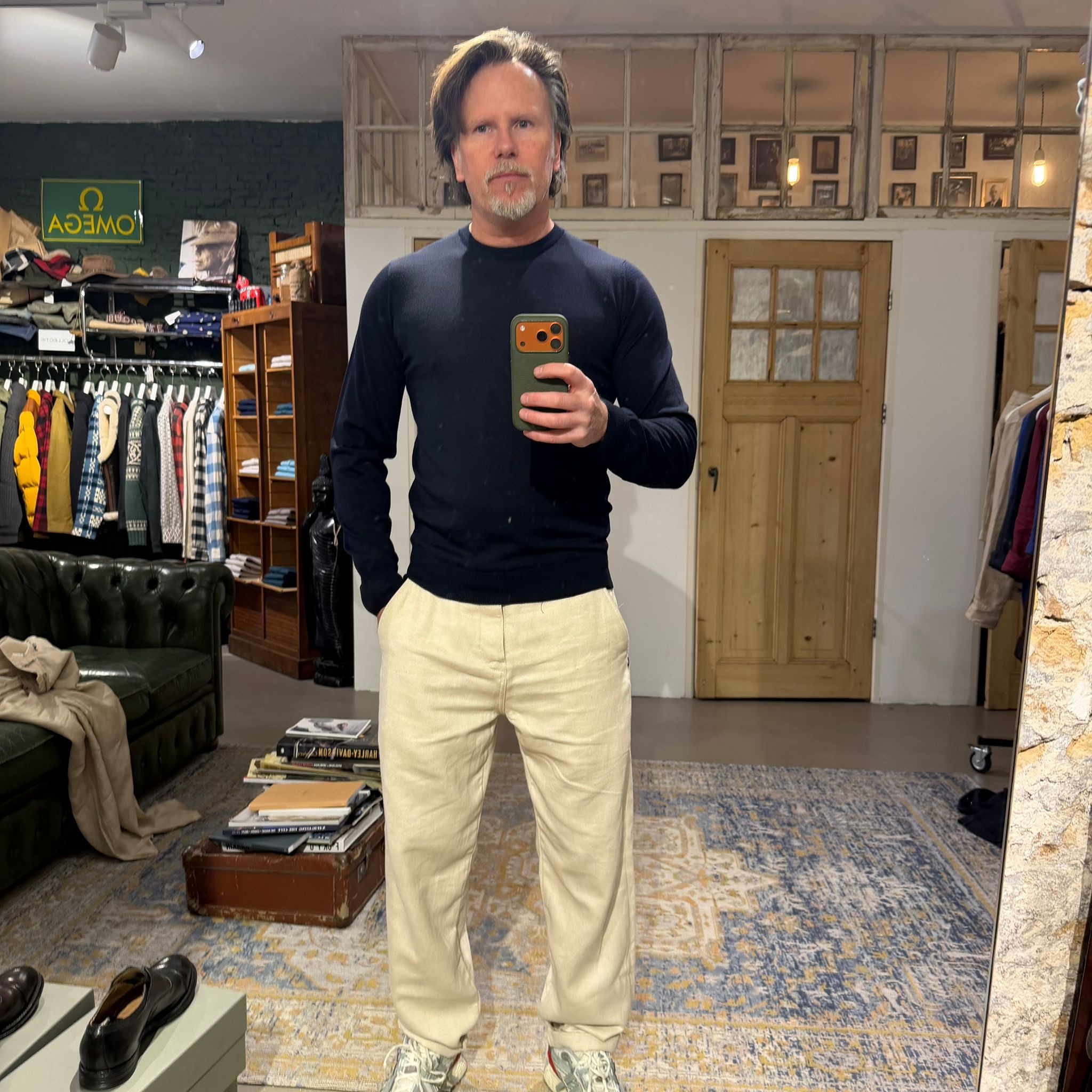 This navy crewneck is all about restraint — clean lines, no unnecessary details, just a sharp silhouette and a seriously refined feel. The knit is lightweight and smooth, giving it that almost fluid drape that sits perfectly on the body without clinging.