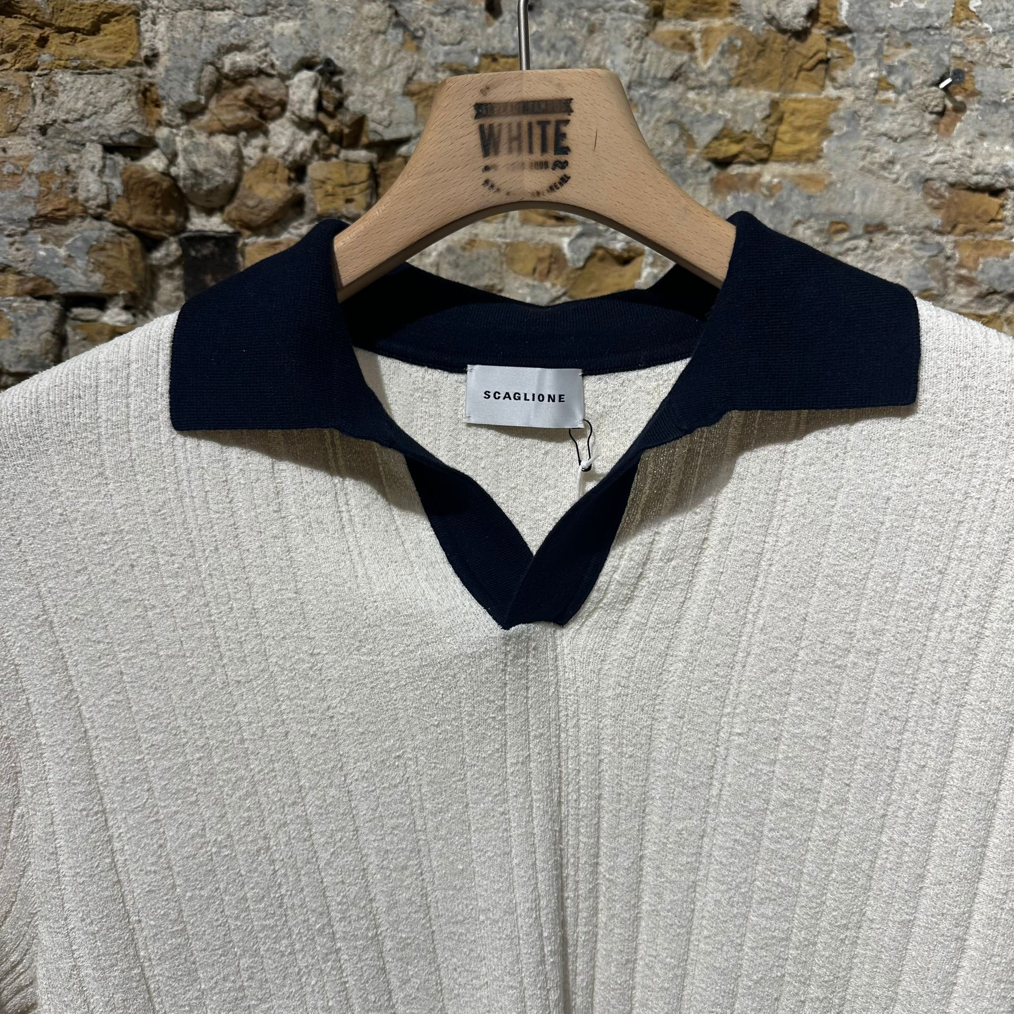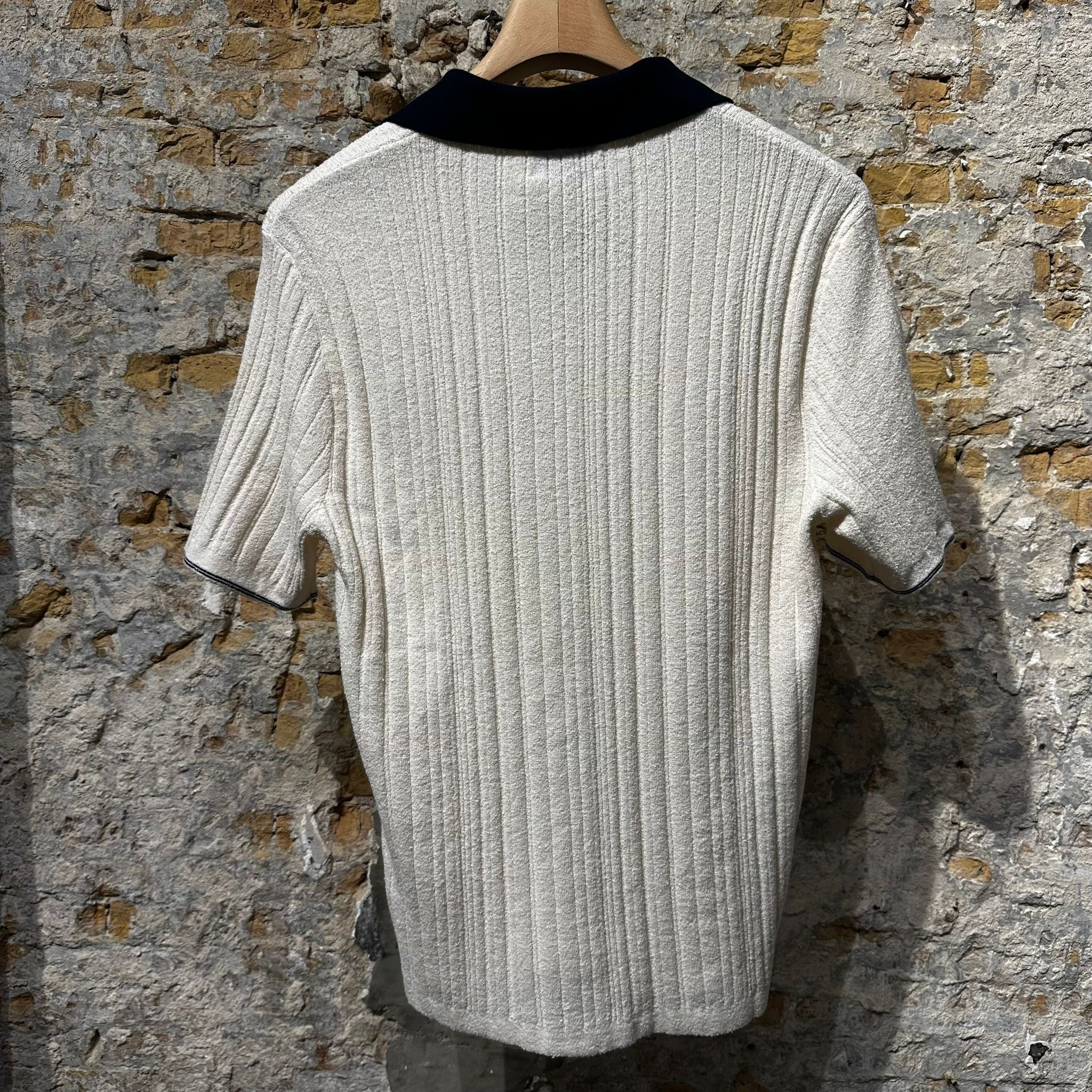 An elegant short-sleeve knit polo in a refined off-white tone, elevated by a contrasting navy collar and subtle sleeve detailing. The vertical ribbed texture enhances the silhouette, creating a sharp yet effortless look.