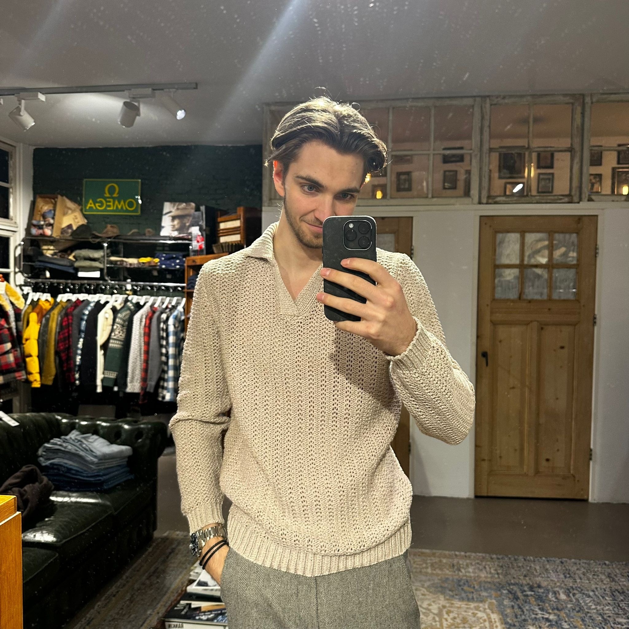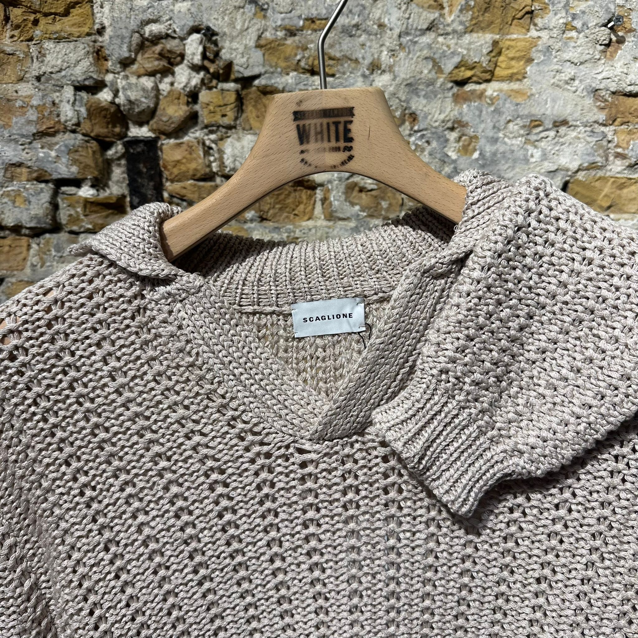 A beautifully crafted knit sweater in a warm sand tone, defined by its rich, chunky texture that adds depth and character. The open collar and soft V-placket give it a relaxed yet sophisticated attitude.