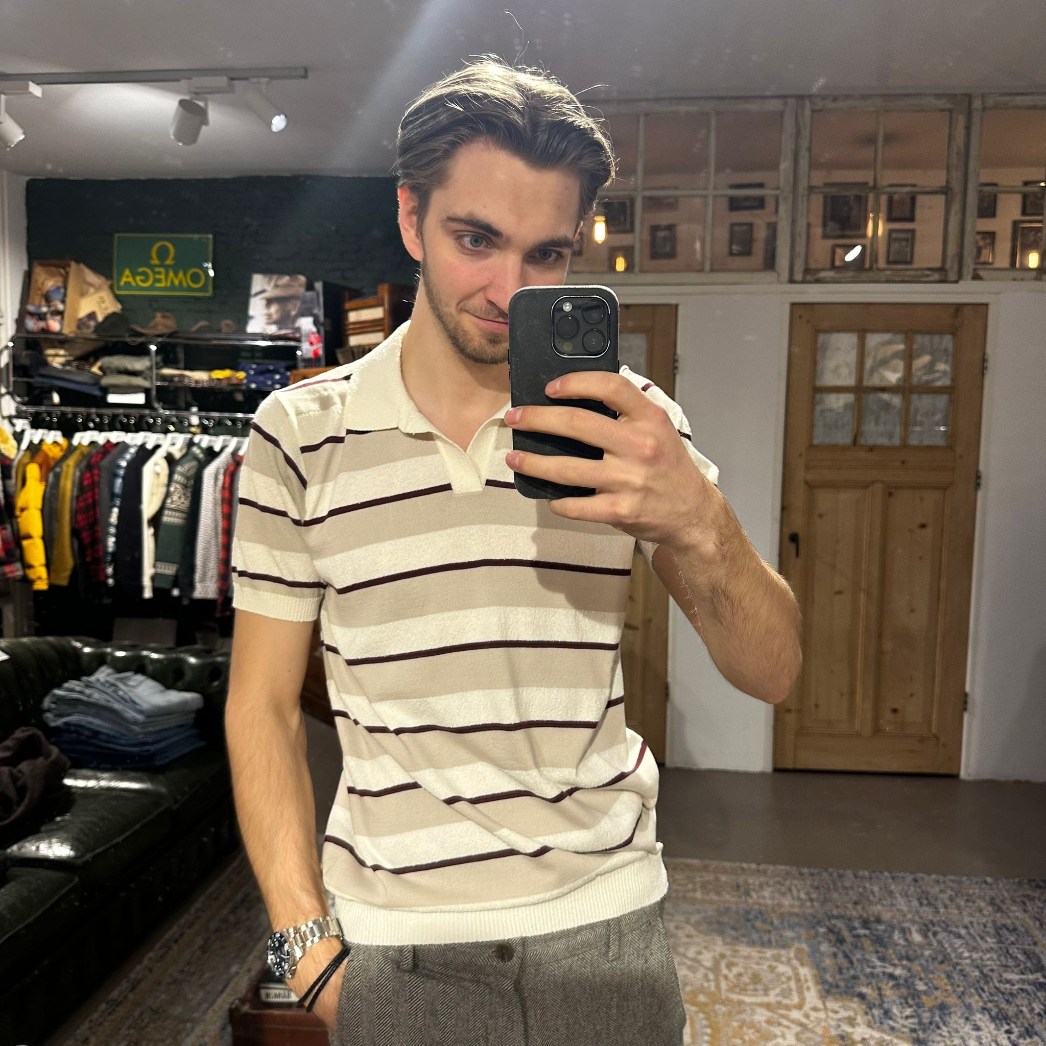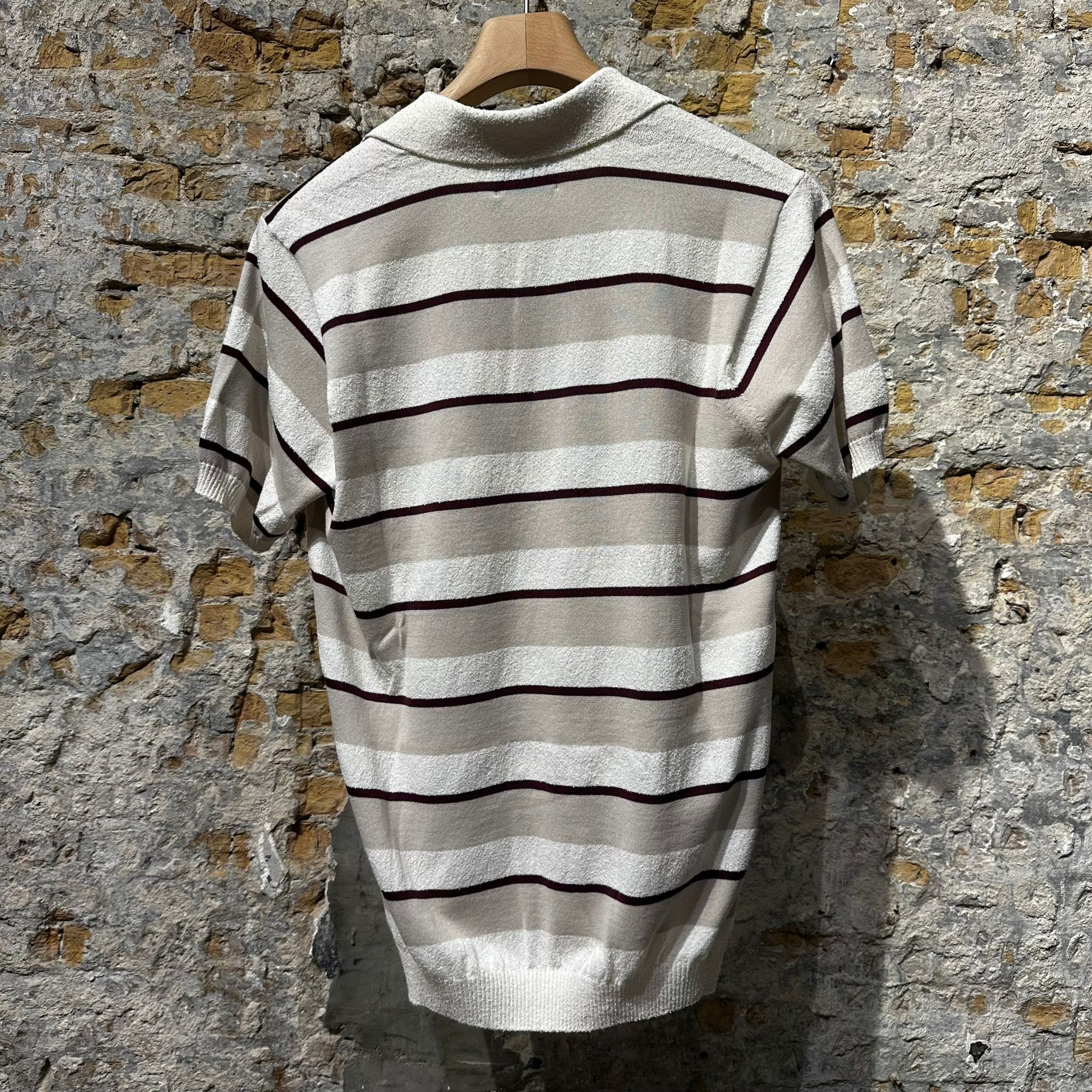 A characterful knit polo crafted in a soft, textured yarn that gives subtle depth and a luxurious hand feel. The horizontal stripes in warm neutral tones with deep burgundy accents create a refined vintage-inspired look.