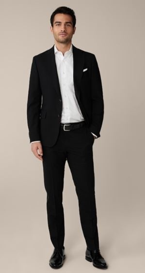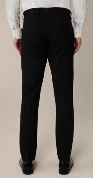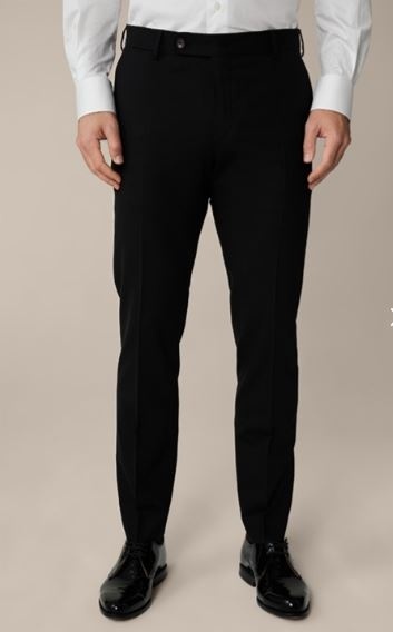 The windsor. Bene modular trousers in black exude confidence and style for sophisticated business looks. A fitted waistband with button fastening and concealed zip along with classic back pockets and pressed creases add style-defining accents. The colour-coordinated AMF stitching on the front pockets enhances the clean design of the trousers in stretch virgin wool quality.