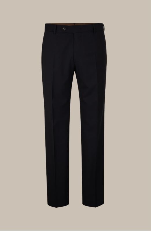 The windsor. Bene modular trousers in navy exude confidence and style for sophisticated business looks. A fitted waistband with button fastening and concealed zip along with classic back pockets and pressed creases add style-defining accents. The colour-coordinated AMF stitching on the front pockets enhances the clean design of the trousers in stretch virgin wool quality.